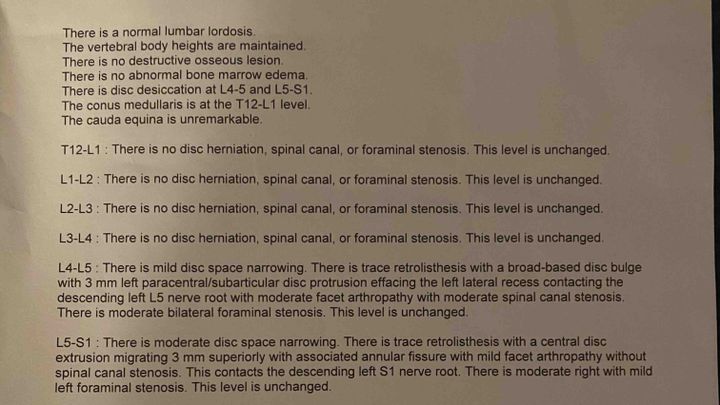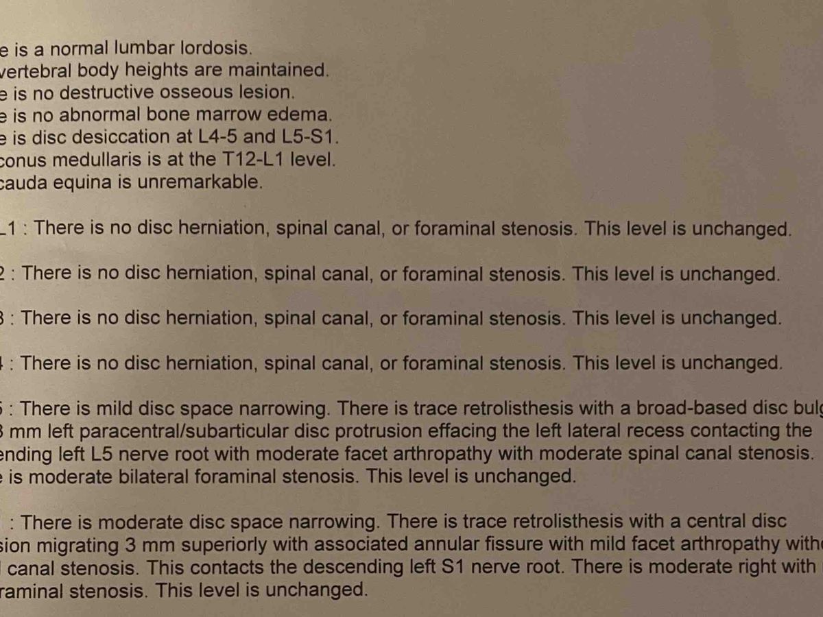 Now, the relief is wearing off again. My MRI shows severe degeneration at L4-L5 and L5-S1, where the discs are collapsing and pressing against critical nerves. There’s also a tear in one of the discs (an annular fissure) and signs of retrolisthesis, where my vertebrae are starting to slip out of alignment from lack of support. This is causing spinal stenosis and nerve compression that make walking, sleeping, and concentrating on work a daily struggle.