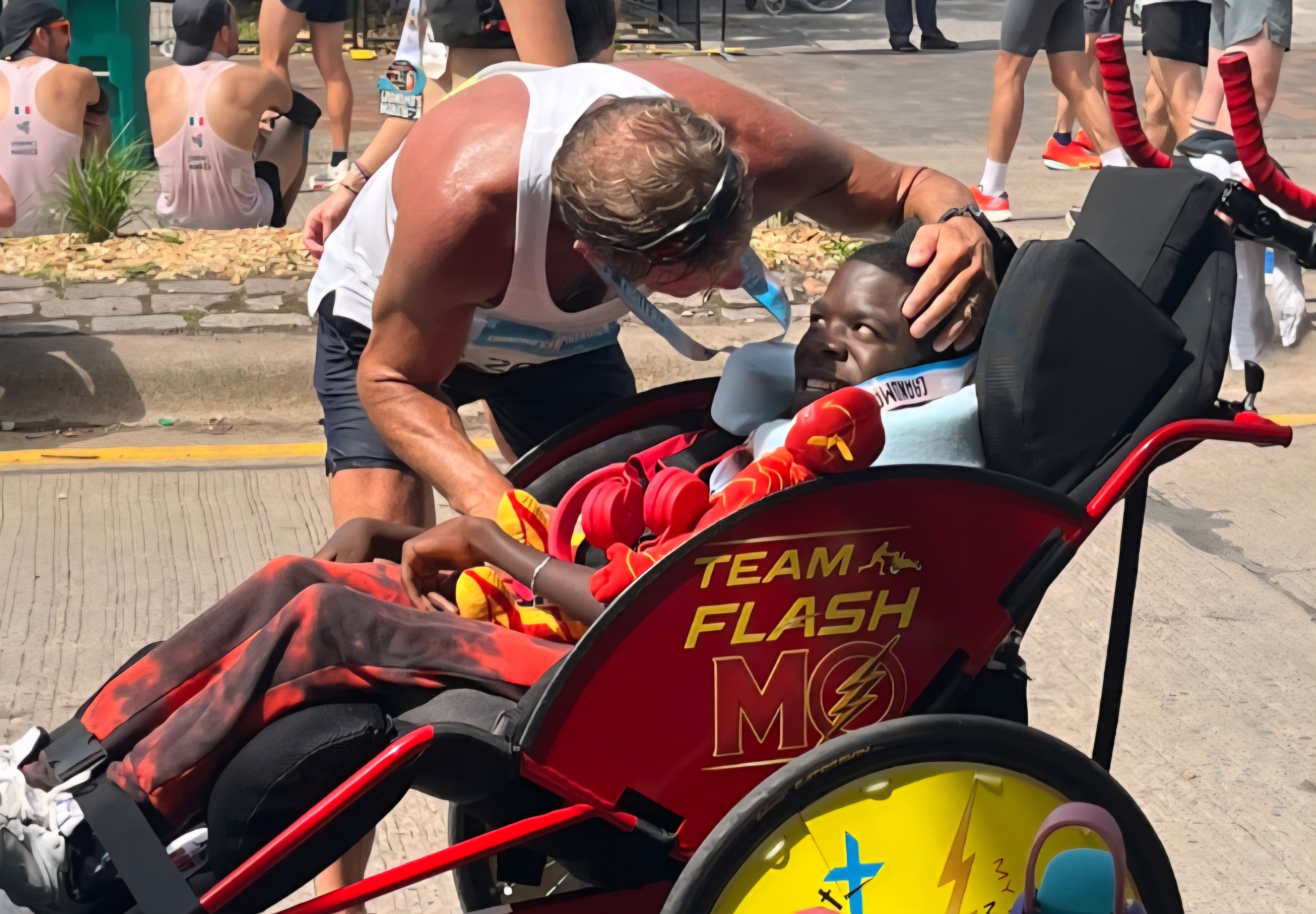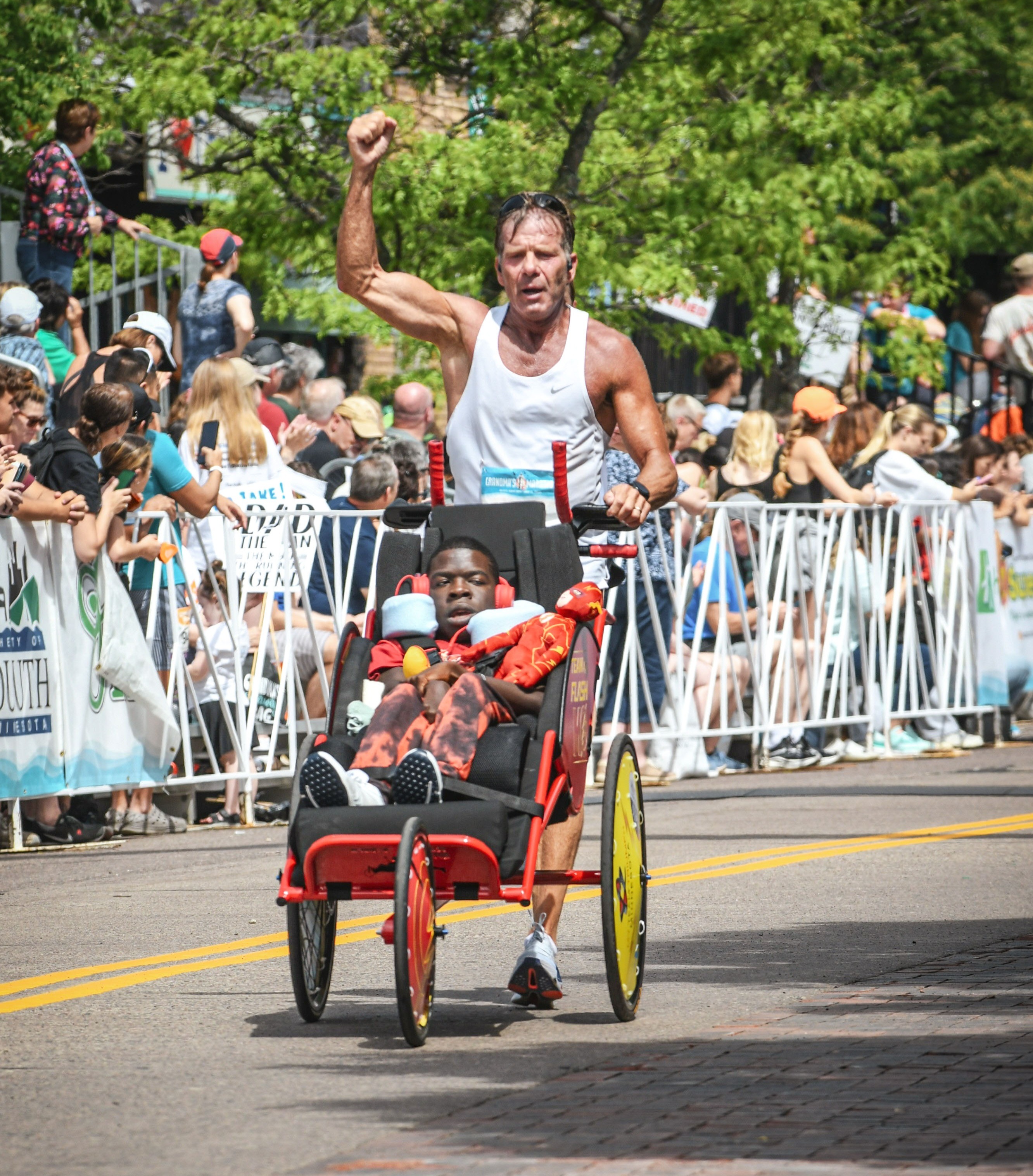 Before that race, Mark helped secure a brand-new, custom Team Flash Mo racing chair from Hoyt/AdaptX, bright red and built for speed. This spring, Moses and Mark will make history as the first duo team from myTEAM TRIUMPH Minnesota to compete in a major marathon.