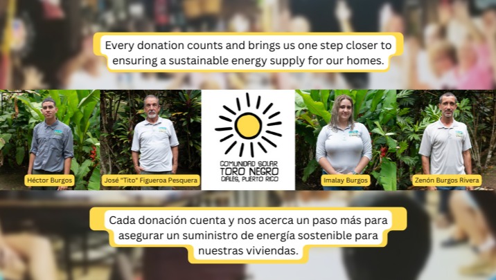 ¡Únete a la Comunidad Solar Toro Negro Inc. y brinda tu apoyo a esta increíble iniciativa de recaudación de fondos! Nuestra meta es reunir $250,000 para garantizar el reemplazo de las baterías que alimentan las microrredes, las cuales generan energía solar para 28 hogares de nuestra comunidad.