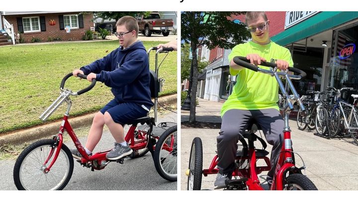 Like many people with Down syndrome, Cam has low muscle tone and he has never mastered the motor skills needed to ride a typical bicycle. An adaptive trike was donated to Cam so that he could experience the freedom and independence associated with bike riding while also receiving the support he needed to allow him to do so. The trike is pushed by an adult while Cam is riding so that the bike moves his leg muscles in a way to actually teach him the motions needed to ride a bike. Cam’s trike was fun, exercise, independence, and therapy all in one.