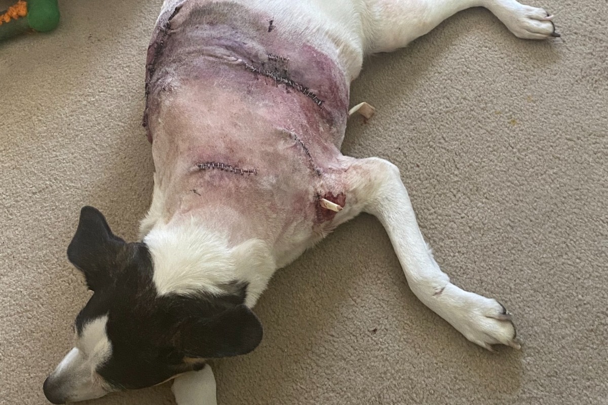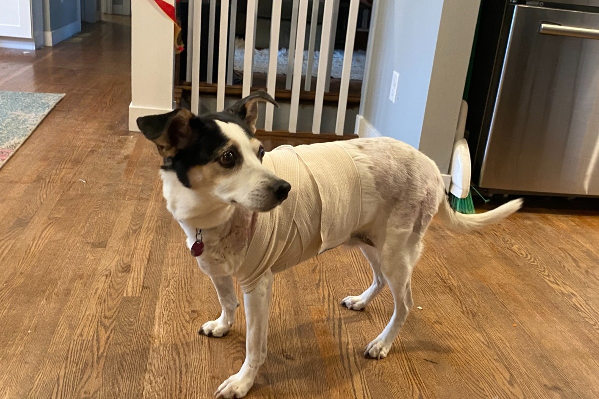 Hi! This is Josie, a senior terrier mix who has experienced a ruff few months. Sweet Josie lost her owner in early March and then a month later, while out on her daily walk, she was attacked by a Great Dane. The dog was let outside by a friend helping out the owner who was working a 13 hr shift. Josie suffered some major wounds and required emergency surgery. My wife's elderly grandma had been taking care of Josie and didn't know if she could do the work to nurse Josie back to health post surgery. My wonderful, animal loving wife, Molly took Josie into our home to do daily bandage changes, debridement of wounds and monitored her quality of life.