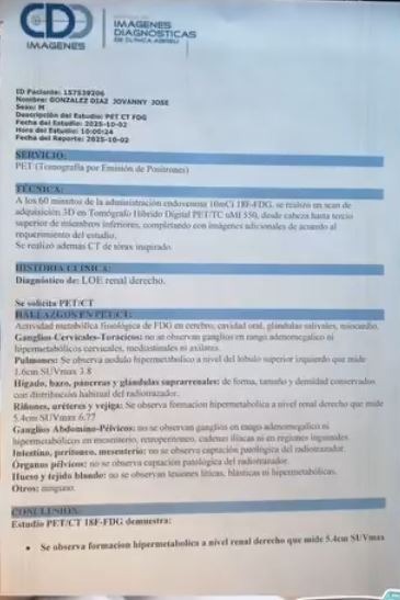 En los últimos meses ha tenido que someterse a múltiples estudios especializados, incluyendo tomografías y PET scan, donde se confirmó la presencia de una masa tumoral de aproximadamente 5.4 cm en el riñón derecho, además de otras lesiones que requieren tratamiento inmediato.