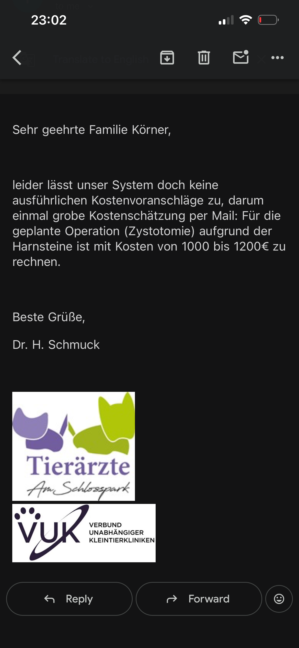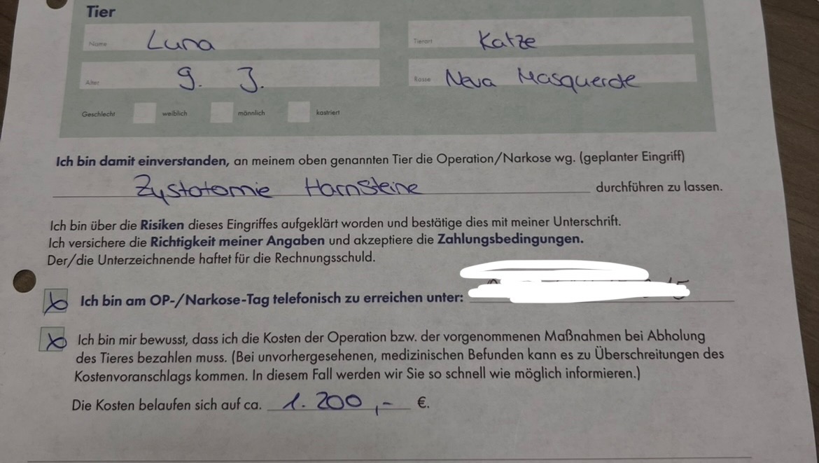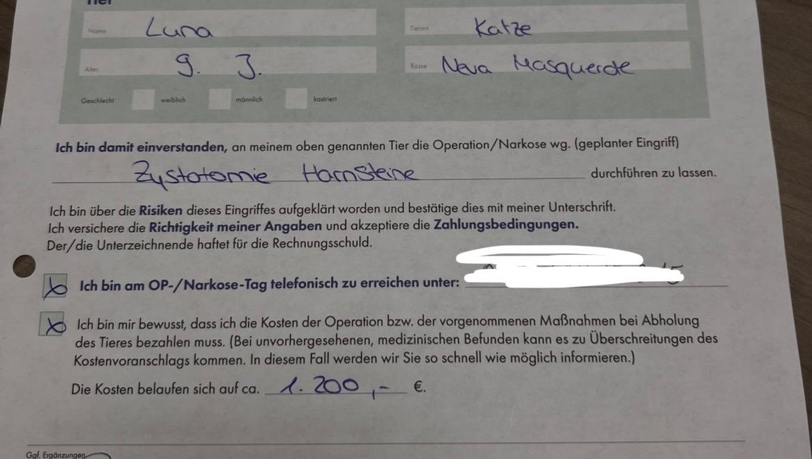 We were also given a written agreement that the costs of her surgery will be around 1200€.