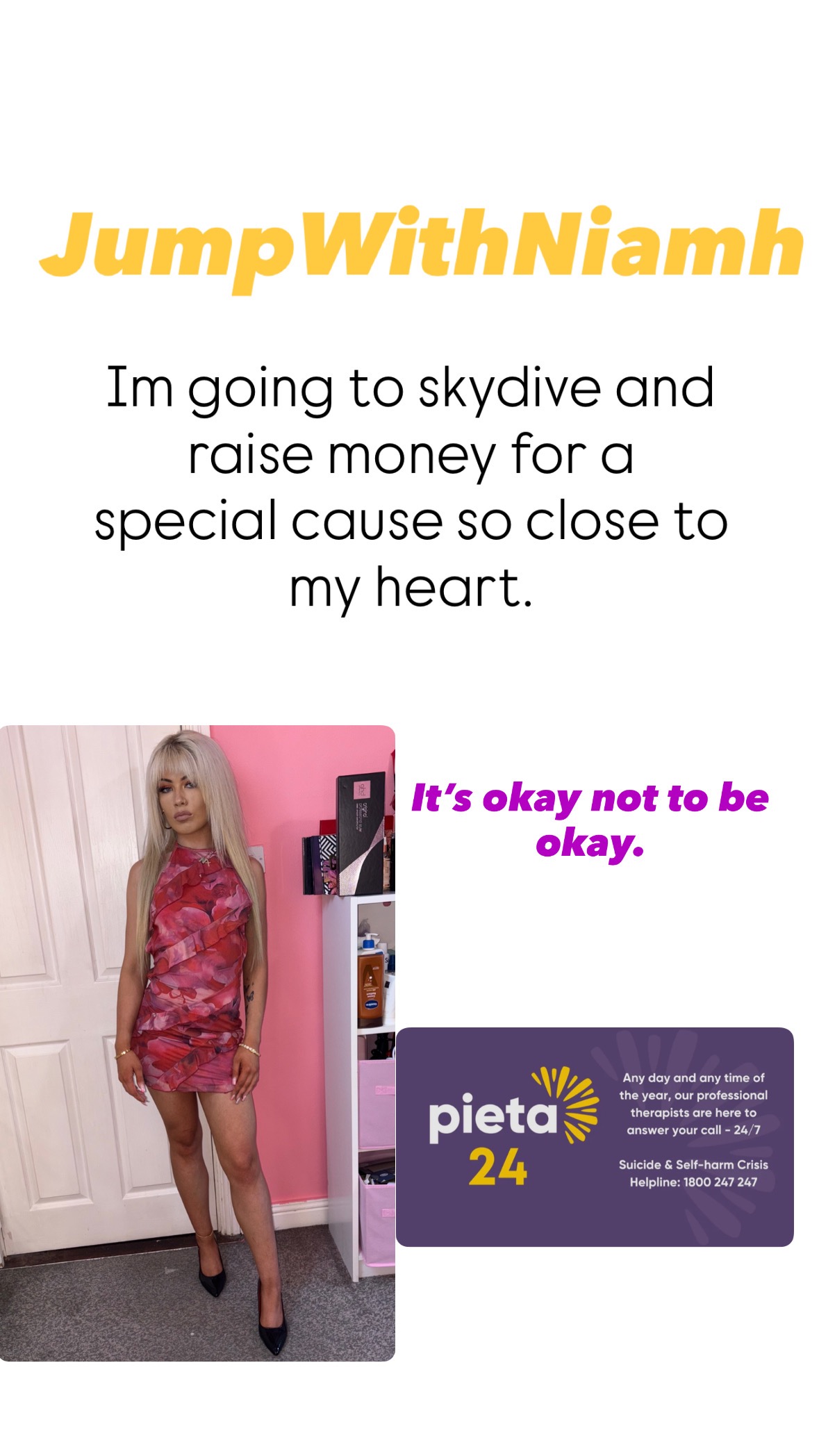 My name is Niamh and I am going to be Skydiving, raising money for Pieta!