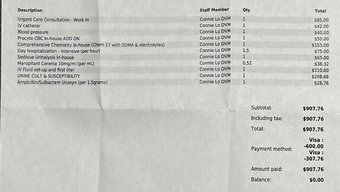 Hi, Friends! Juniper, my sweet kitty (5 years old), was hospitalized today. I was out of the country when I received the news and he is currently under care at Dove Lewis after having been seen at Buckman Vet (see bill attached). Thankfully a friend was able to take him and to get care.