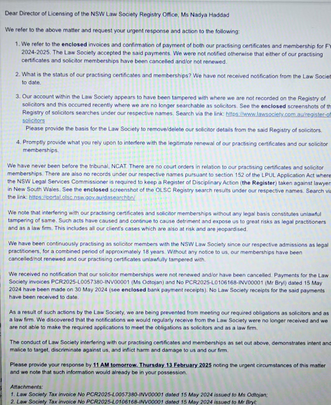6. There was no due process, no orders/determination to provide a lawful basis for the acts done to Ms Odtojan and Mr Bryl practising certificates, memberships and the deletion of their solicitor records in the LS NSW Solicitors.