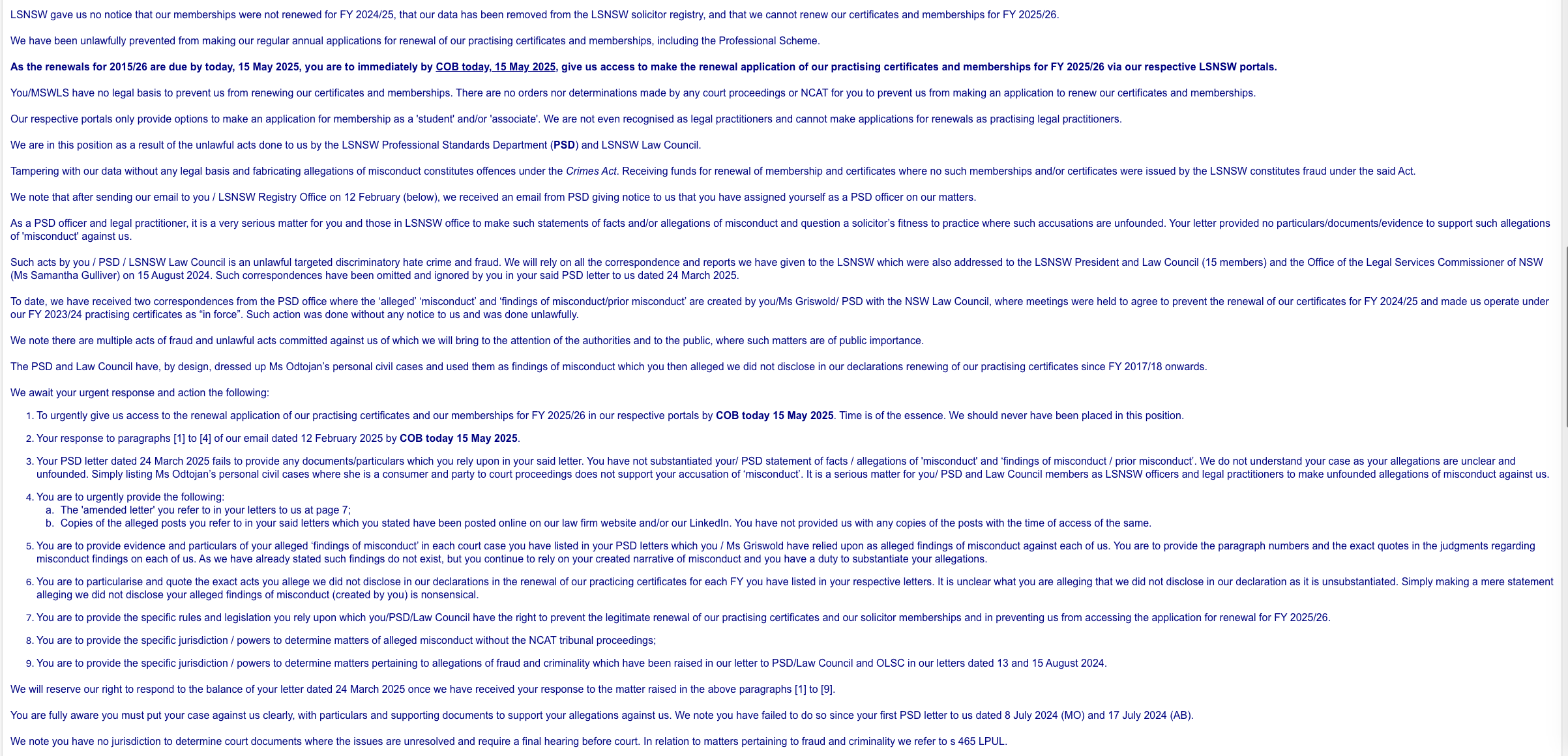 3. Sometime in May 2024 The Law Society Professional Standard Department (PSD), the Law Council (15 members), Registry Office and the Office of the Legal Services Commissioner (OLSC), collectively referred to as LS Members engaged in the unlawful act of tampering with and preventing the legitimate renewals of the practising certificates of Ms Odtojan and Mr Bryl for FY 2024/25.