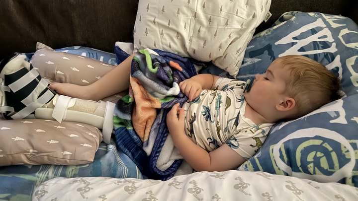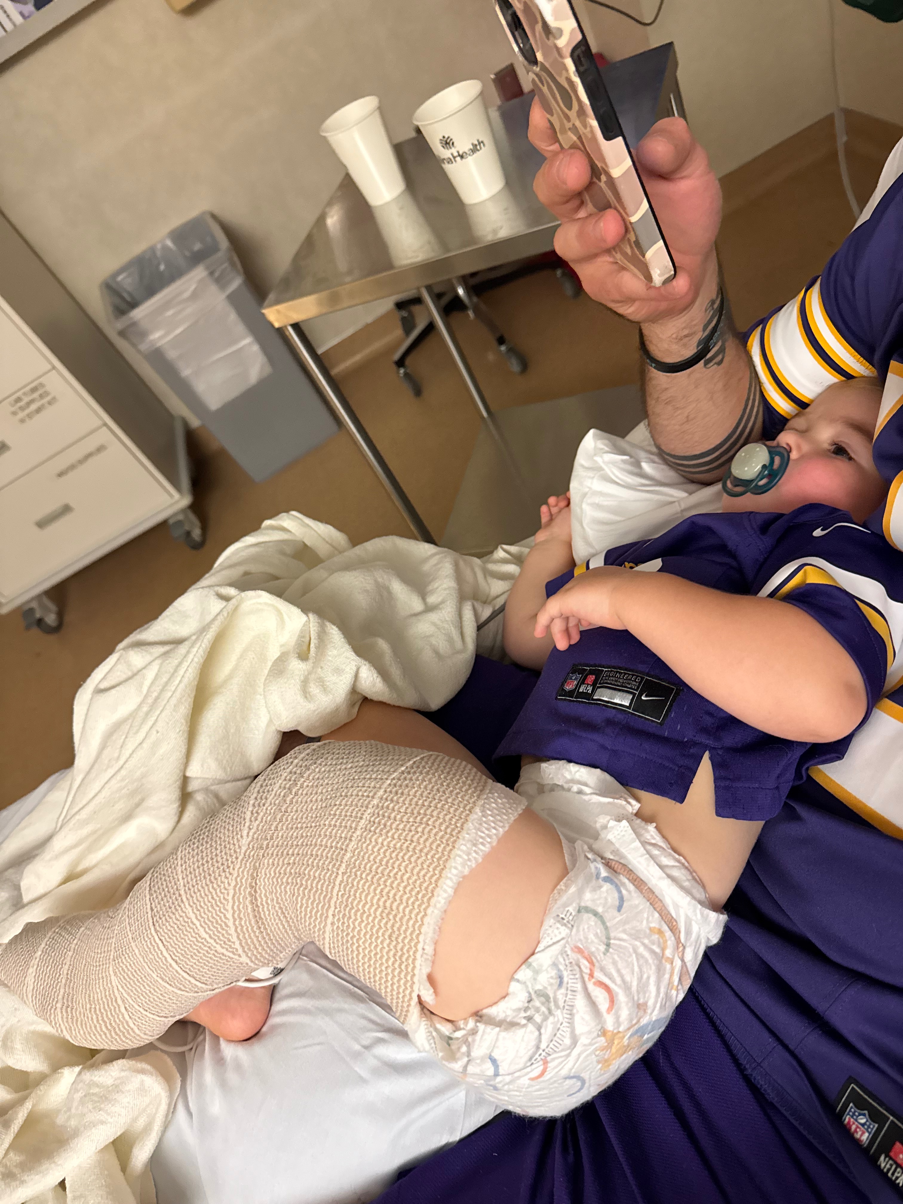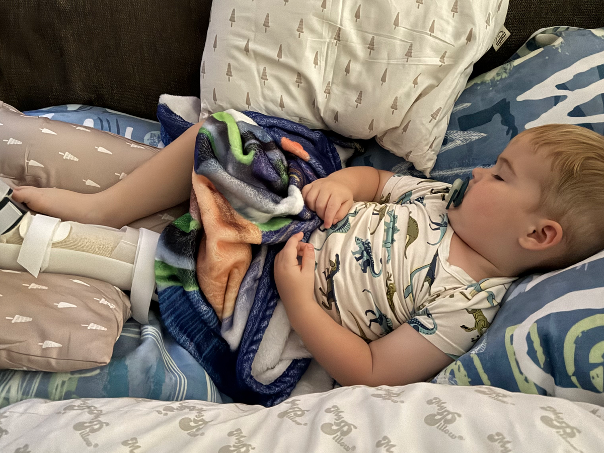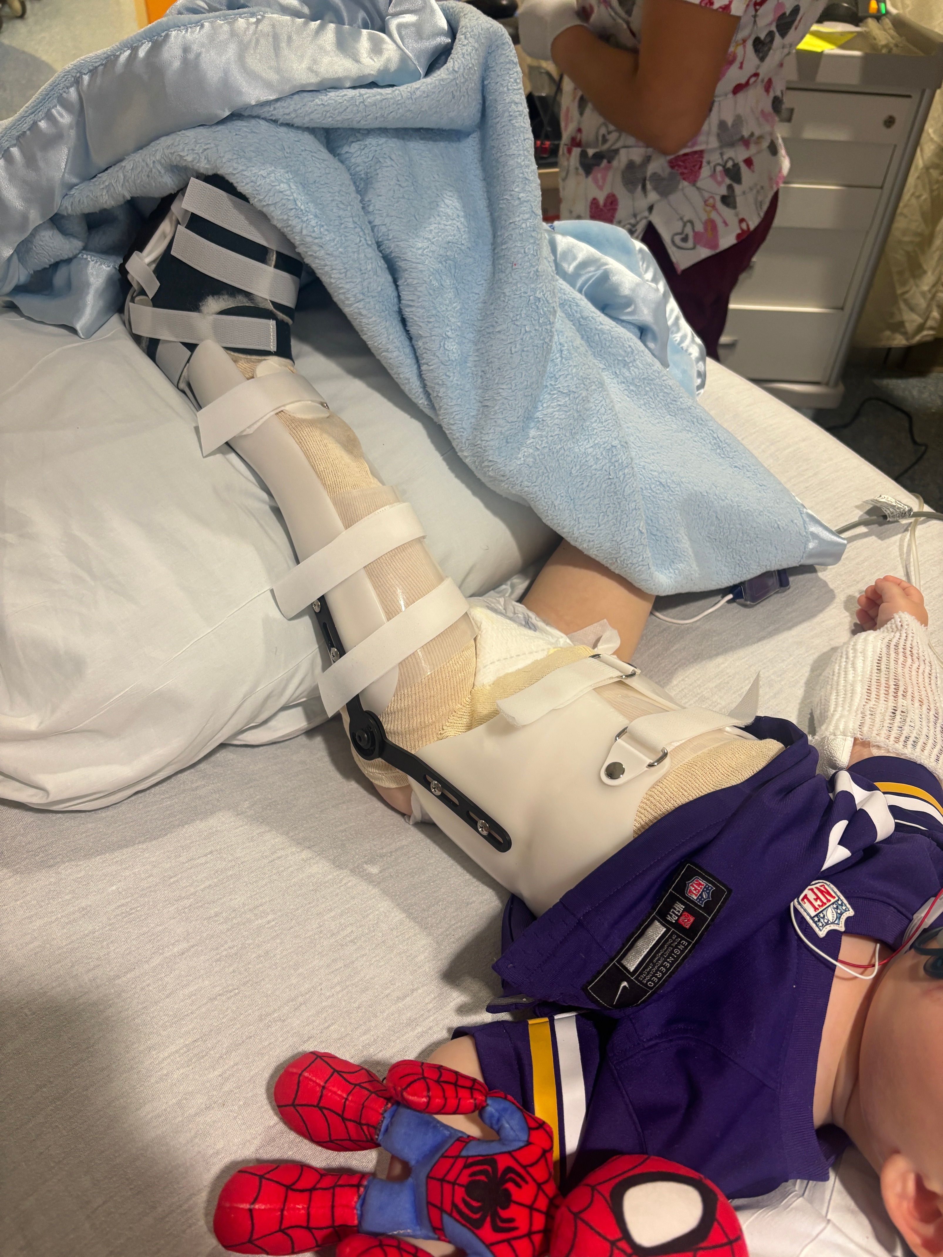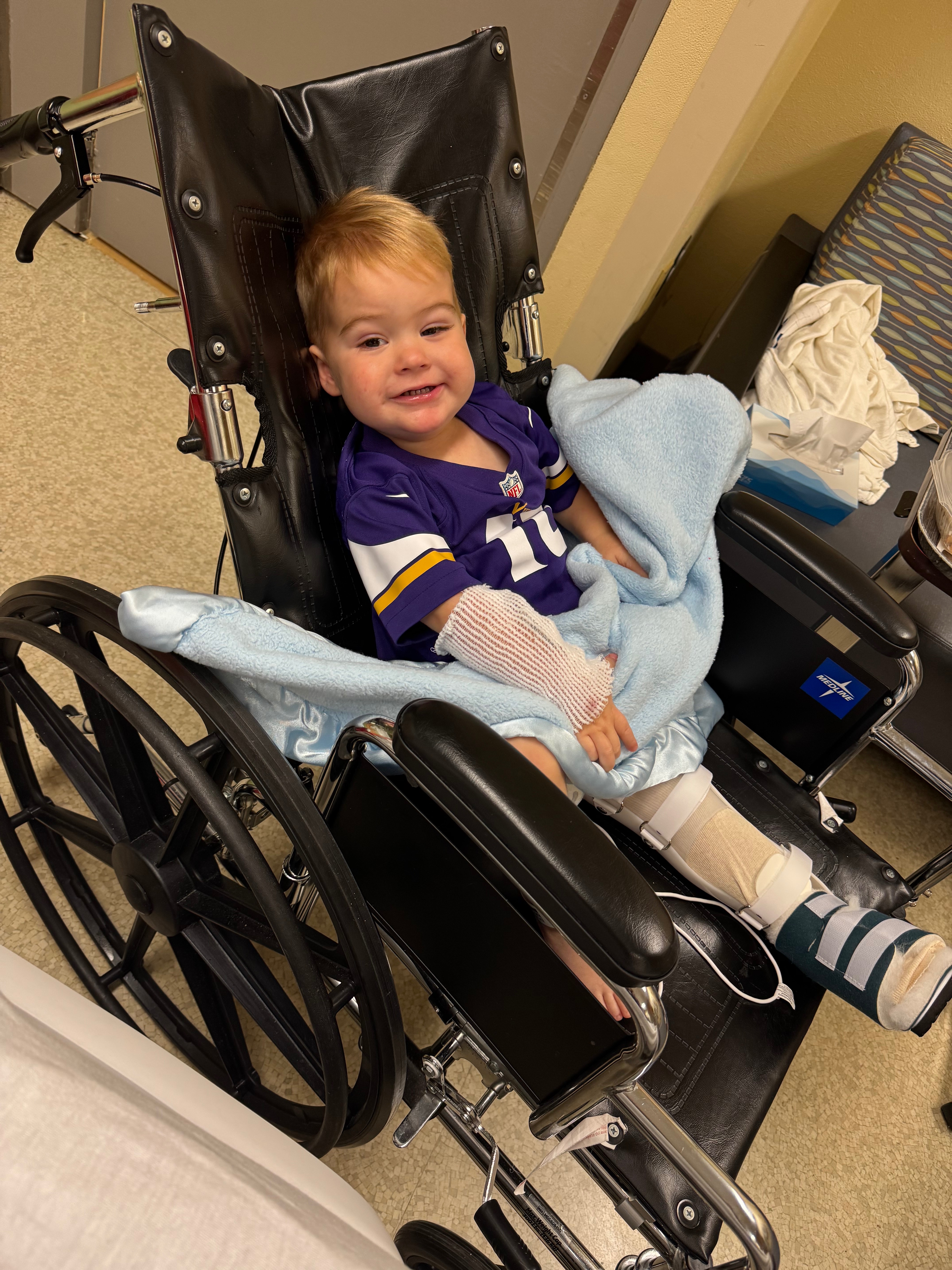 On Sunday, October 5th our sweet boy Weston tripped and fell while playing in the living room at home, fracturing his left femur. After rushing him to St. Francis Hospital ER for x-rays and finding out he had broken the bone, he was fitted with a full leg splint and transferred by ambulance to HCMC for surgery. Doctors there determined to fit him with a spica brace vs surgery. This brace is a new technology which was to keep him immobile while maintaining a 45-degree angle for his leg to heal properly over the next 4-6 weeks. Weston, Mommy & Daddy spent three nights in the hospital before bringing Weston home. He had to be placed in a special laying harness for the car ride and a wheelchair to move about. Moving him just the slightest caused him pain. It has been heartbreaking to witness.