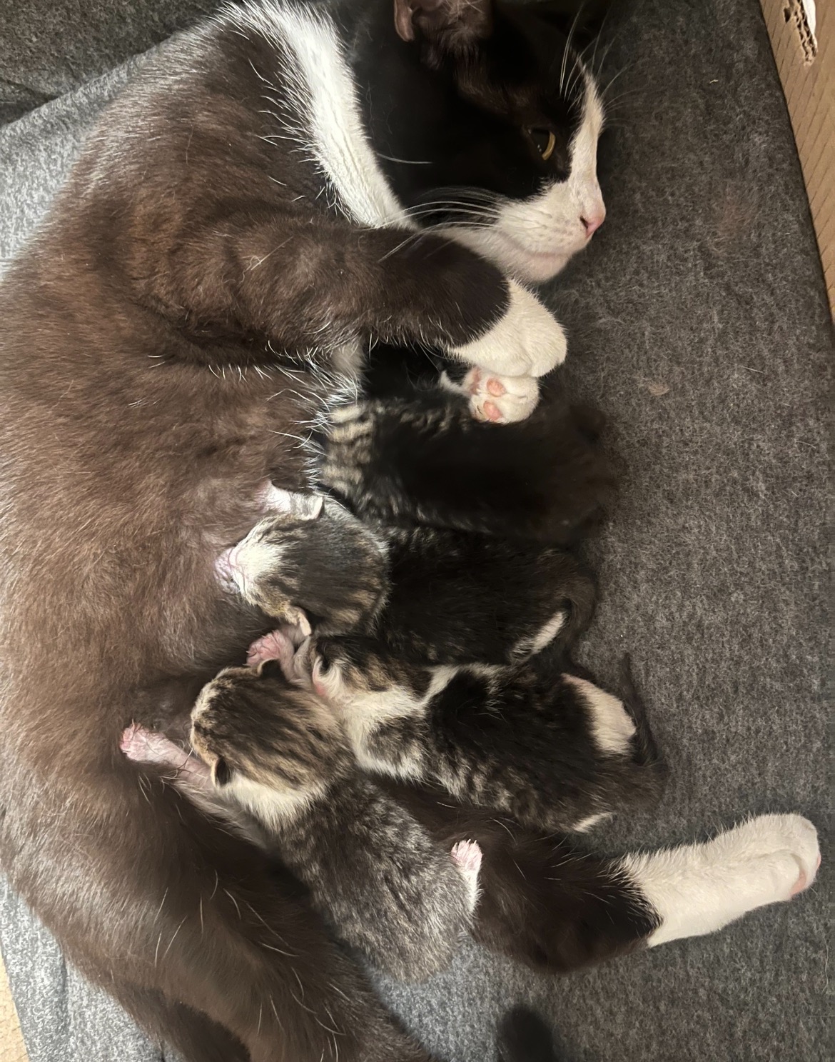 I'm Stina, and I dedicate my time to rescuing cats in need. Right now, I have a very special cat in my care named Bailey. She's just a year old and recently became a mother to four adorable kittens, a little over one week ago.