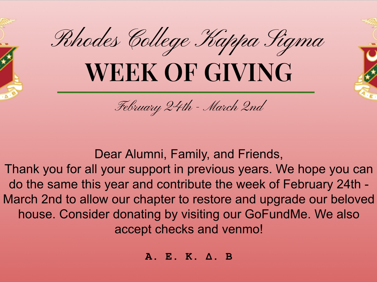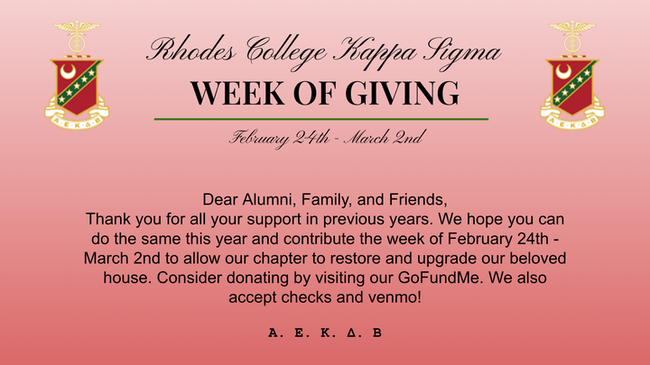 I am Seth Forstot, the Vice President of the Kappa Sigma Phi Chapter. I'm thrilled to announce our Week of Giving! Every year, our chapter seeks donations from alumni, family, and friends to help fund the upkeep and restoration of our beloved chapter house. We've made great strides this year, but many more exciting projects need your help. Below is a list of our projects and their entailments.