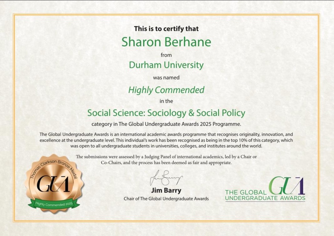 If you would like to know more about my dissertation findings, the work I have been doing with it at Durham University and beyond, the fundraiser itself, or just to keep in touch, you can find me on Linkedln (Sharon Berhane), or you can contact me through this website.