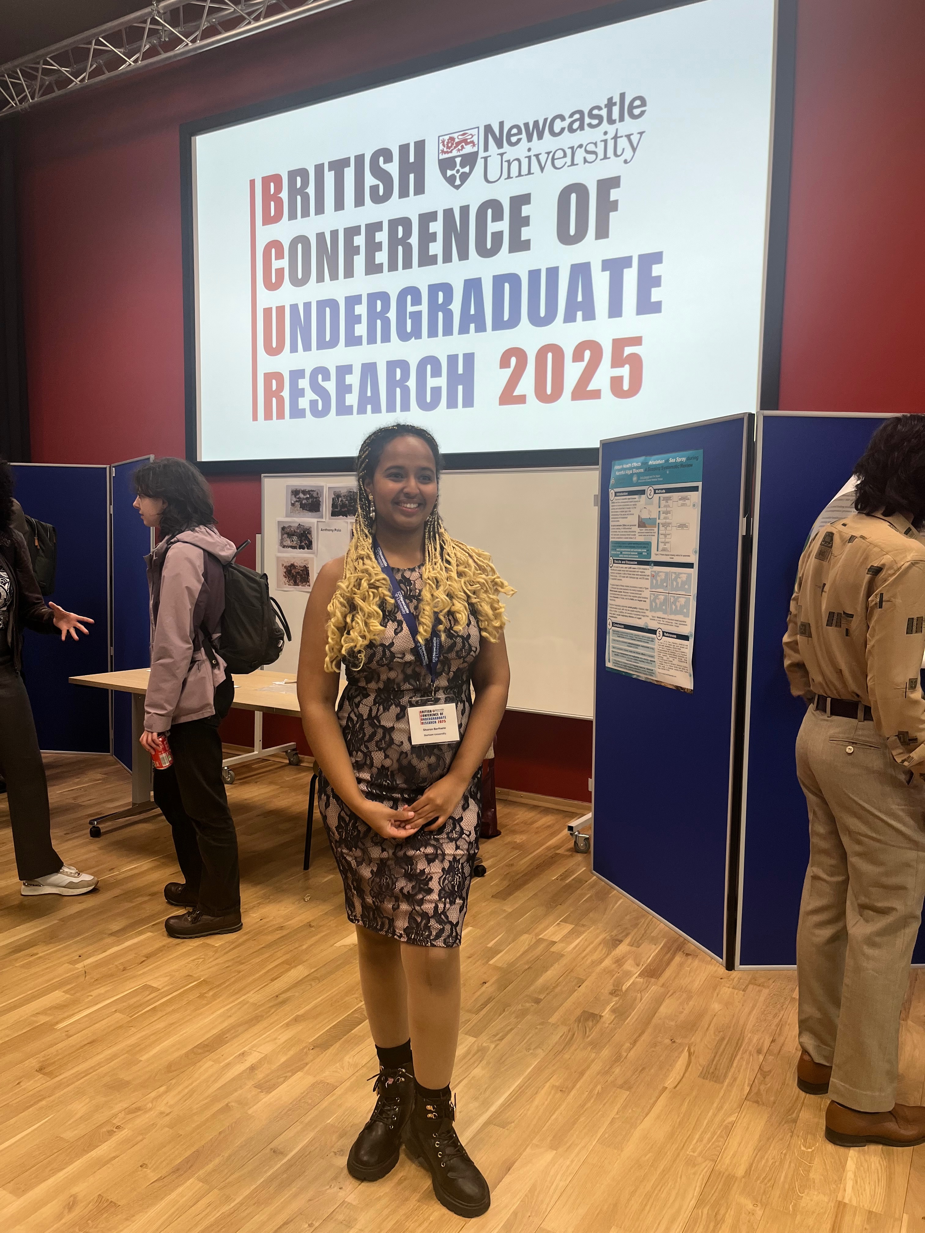 There is a photo of me at the British Conference of Undergraduate Research (2025) after I gave a presentation on my dissertation findings. The BCUR is the largest conference in the UK exclusively for undergraduate research. There is a sign behind me that has the name of the conference and me smiling in the middle of the frame.