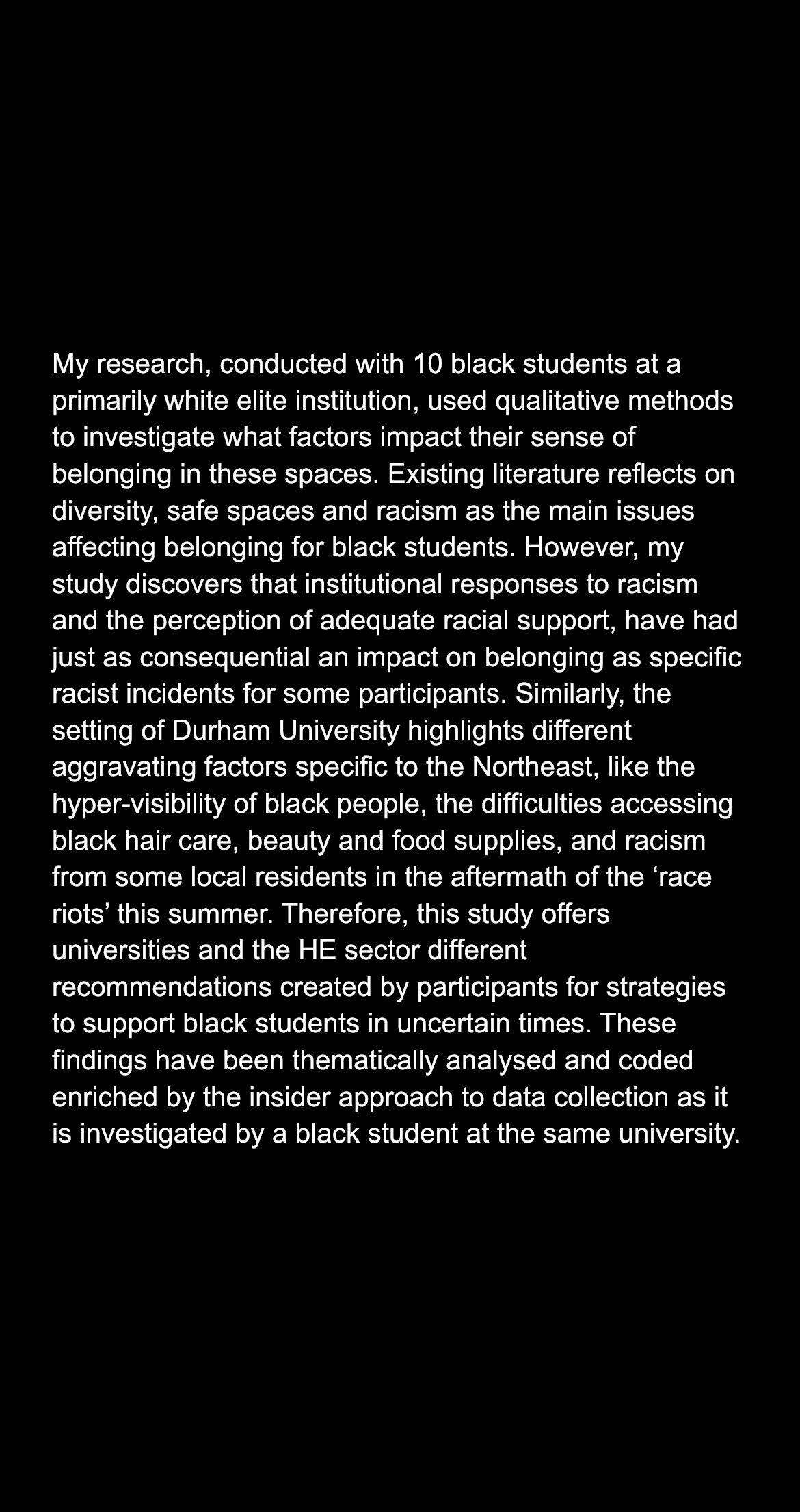 My dissertation is a qualitative study exploring black students’ sense of belonging at elite UK universities. I have attached my abstract as one of the images above.