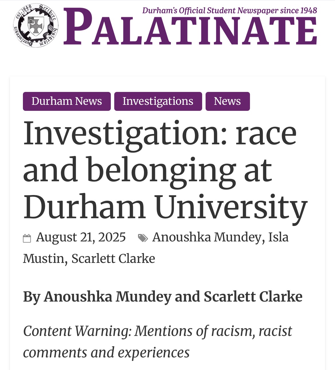 There is an image of the Palatinate article titled ‘Investigation: race and belonging at Durham University’ that incorporates some of my dissertation findings.