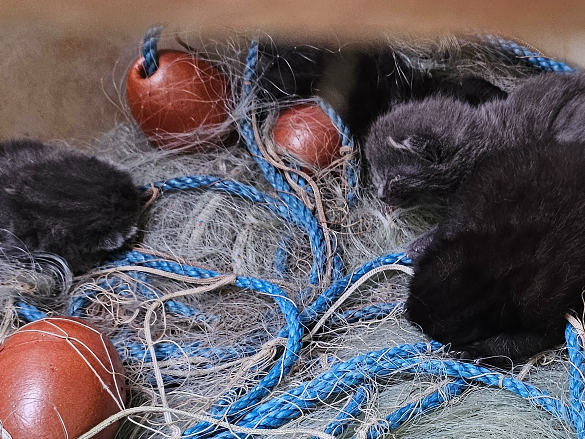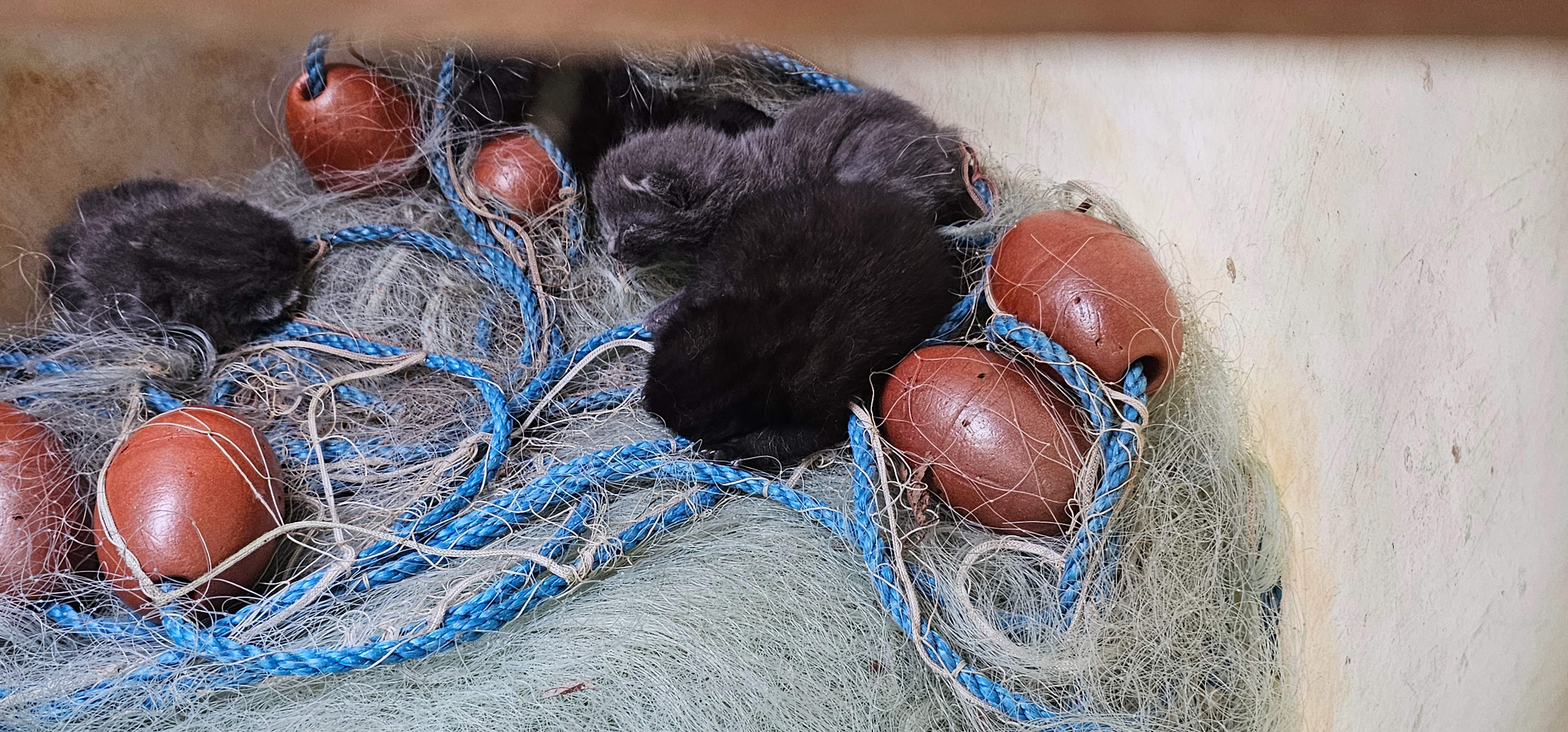 Vor einigen Tagen machten wir eine schockierende Entdeckung: In einem alten Fass, eingewickelt in ein feines Fischernetz, lagen vier neugeborene Kitten. Ihre Mutter hatte sich vermutlich einen vermeintlich sicheren Ort gesucht – doch das Netz wurde zur tödlichen Falle.