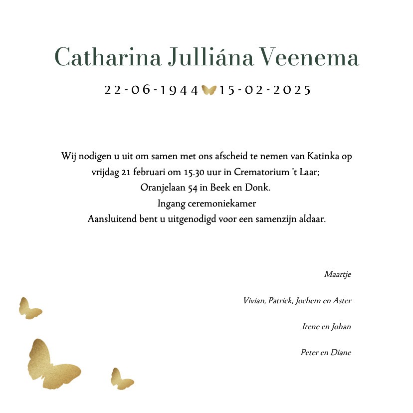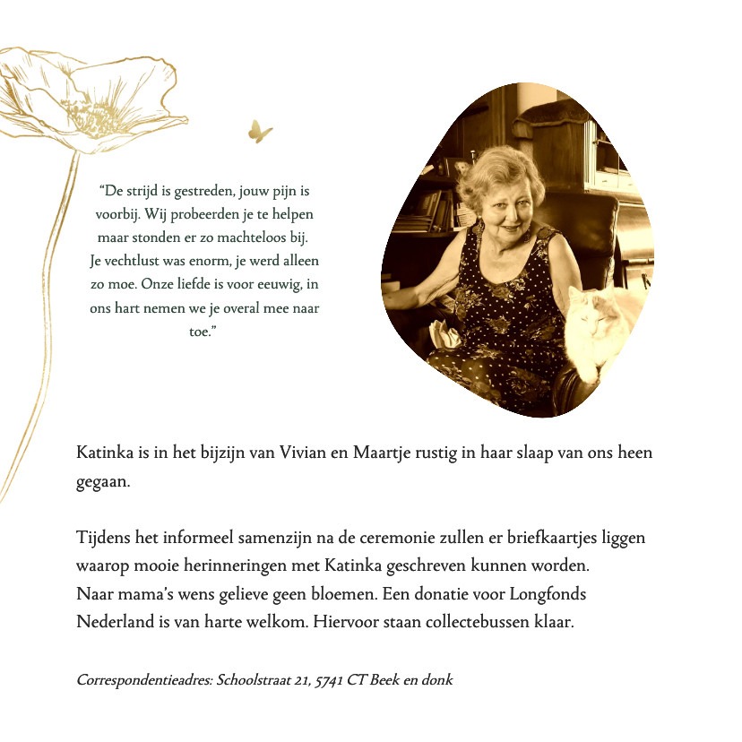 Helaas werden we vrijdags gebeld of we met spoed naar het ziekenhuis wilden komen omdat het niet goed ging. We zijn bij haar gebleven tot ze zaterdagsochtend om 10.10 overleed.