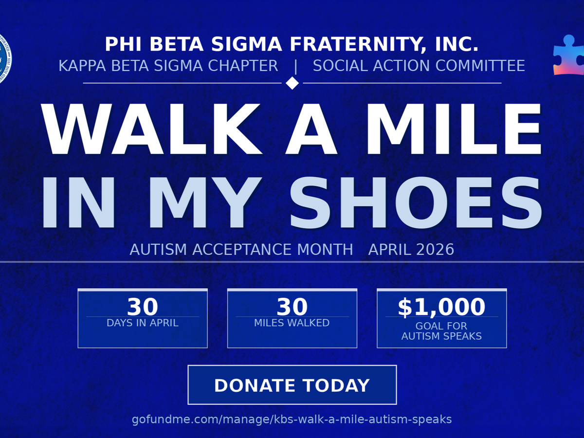 This April, the Social Action Committee of the Kappa Beta Sigma Chapter of Phi Beta Sigma Fraternity, Inc. is proud to host our Autism Acceptance Month campaign. Through our national initiative, "Walk a Mile in My Shoes," our Social Action Committee has committed to walking one mile every day for the entire month of April, 30 days, 30 miles, one powerful purpose with a fundraising goal of $1,000 benefiting Autism Speaks.