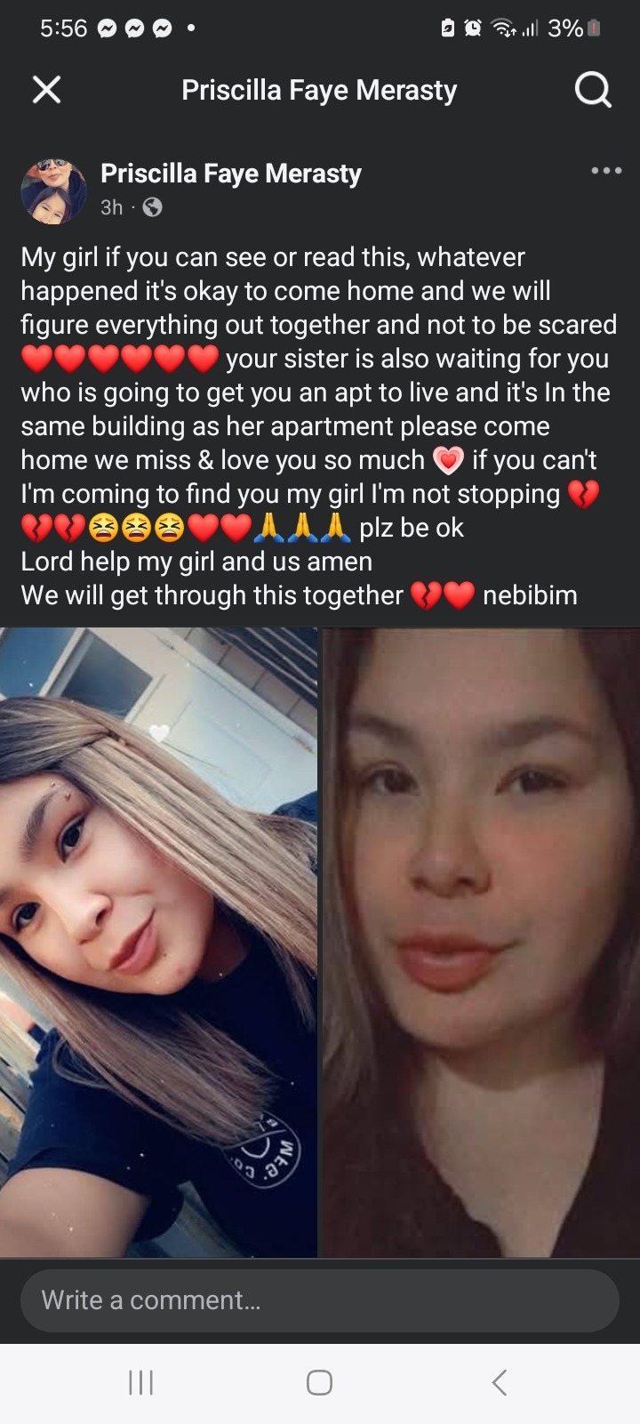 Hi my name is Priscilla Faye Merasty, I am asking for your support to find my daughter Natanis Merasty. Missing since May 5 2025 from the Continental Hotel in Edmonton Alberta. We need assistance for traveling from Saskatchewan to Alberta, accommodations, gas, food, posters, searching materials etc