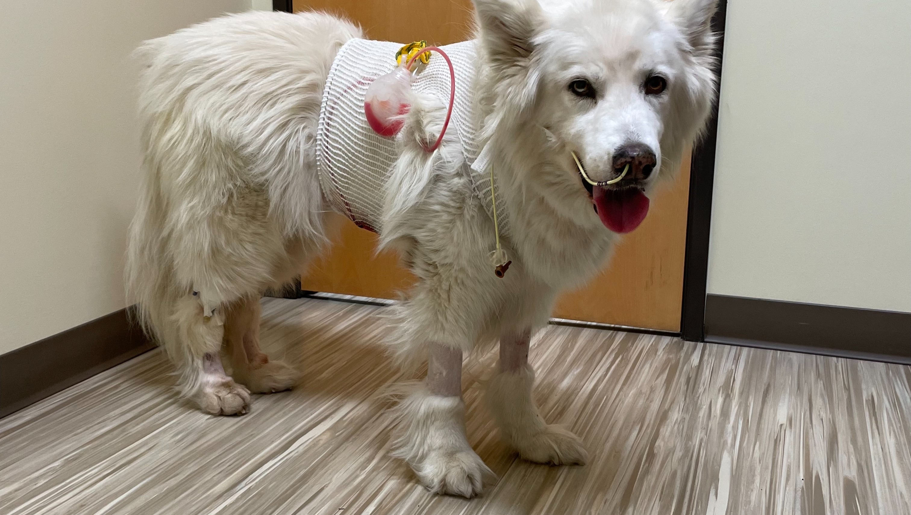 At long last, they finally discharged her! She lost 10 lbs during her hospital stay, but miraculously she never lost her zest for life. Here she is at home after her second surgery, sporting her "Siberian-Poodle Cut", the latest in doggie fashion! She has a journey ahead to reach full recovery, but she's definitely on that road now!