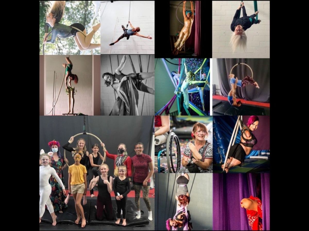 Image: a photo collage with many people who have been a part of our community doing various forms of circus arts over the last five years. Some photos by Virginia Maria Photography and mbeast