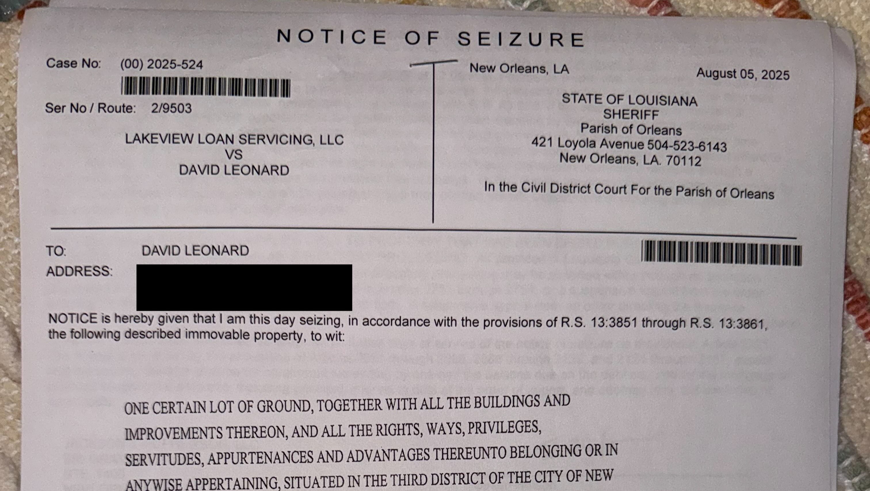 This week the Sherrif's Office in New Orleans put a notice of seizure on the front door of my brother's house. We need to quickly raise between $18,000 - $25,000 to pay for legal fees and get his house out of foreclosure so he has a safe place to land when his nightmare is over.