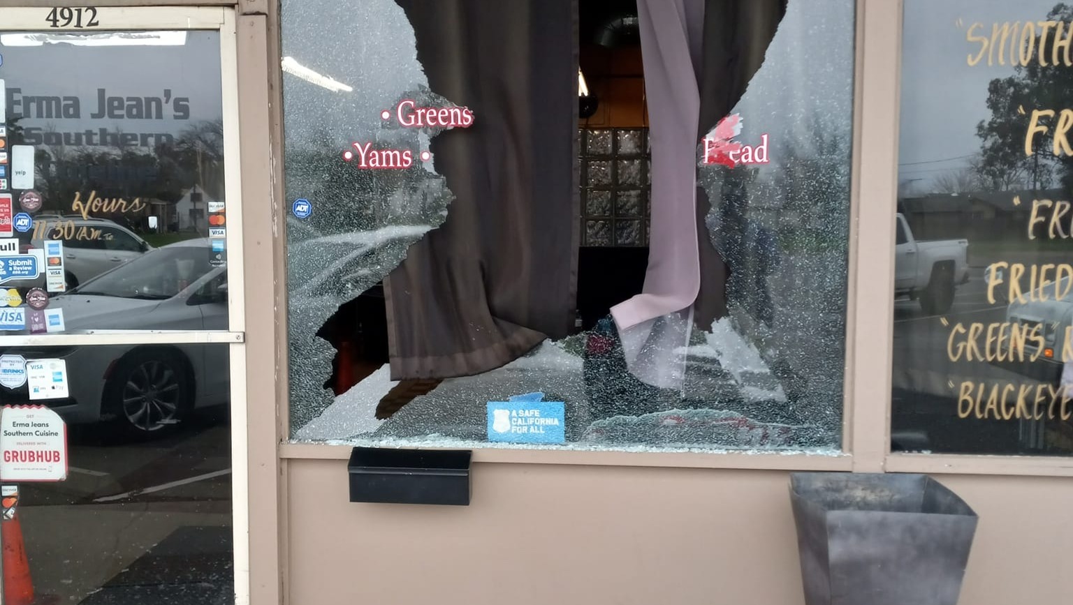 Today I learned that my dear friend Drake Jones's restaurant had been hit with vandalism last night. He came to open ErmaJean's doors for business this morning and found 2 of his very large storefront windows broken, appearing to be hit with a rock.