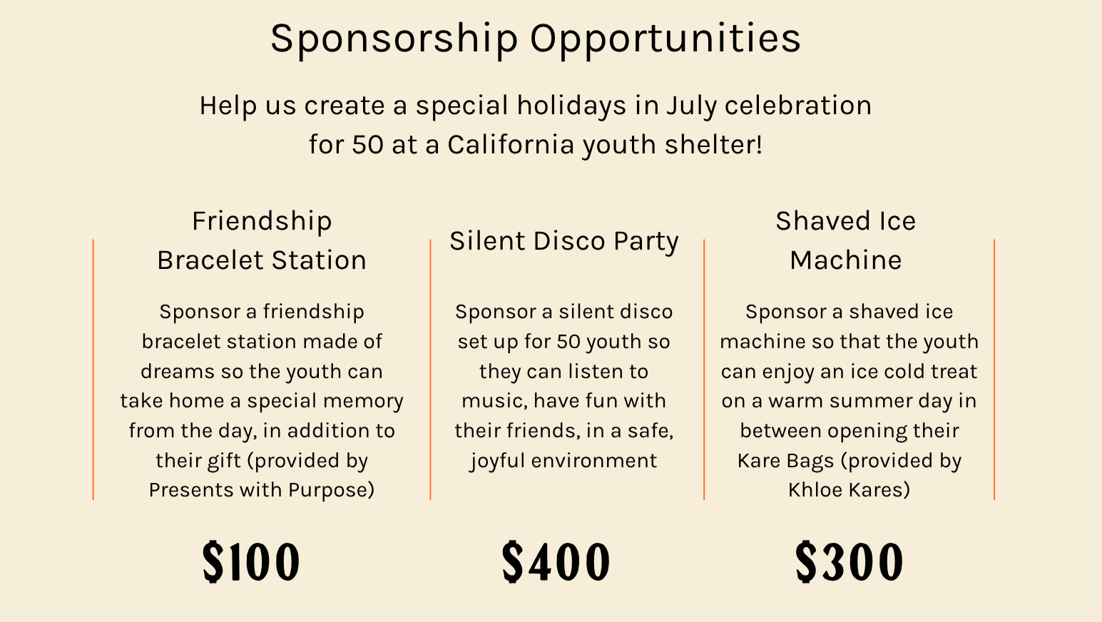 We'll be providing gifts, Kare Bags, and a fun rotation of activity stations to 50 youth at a shelter in Orange County next month. We can't wait!