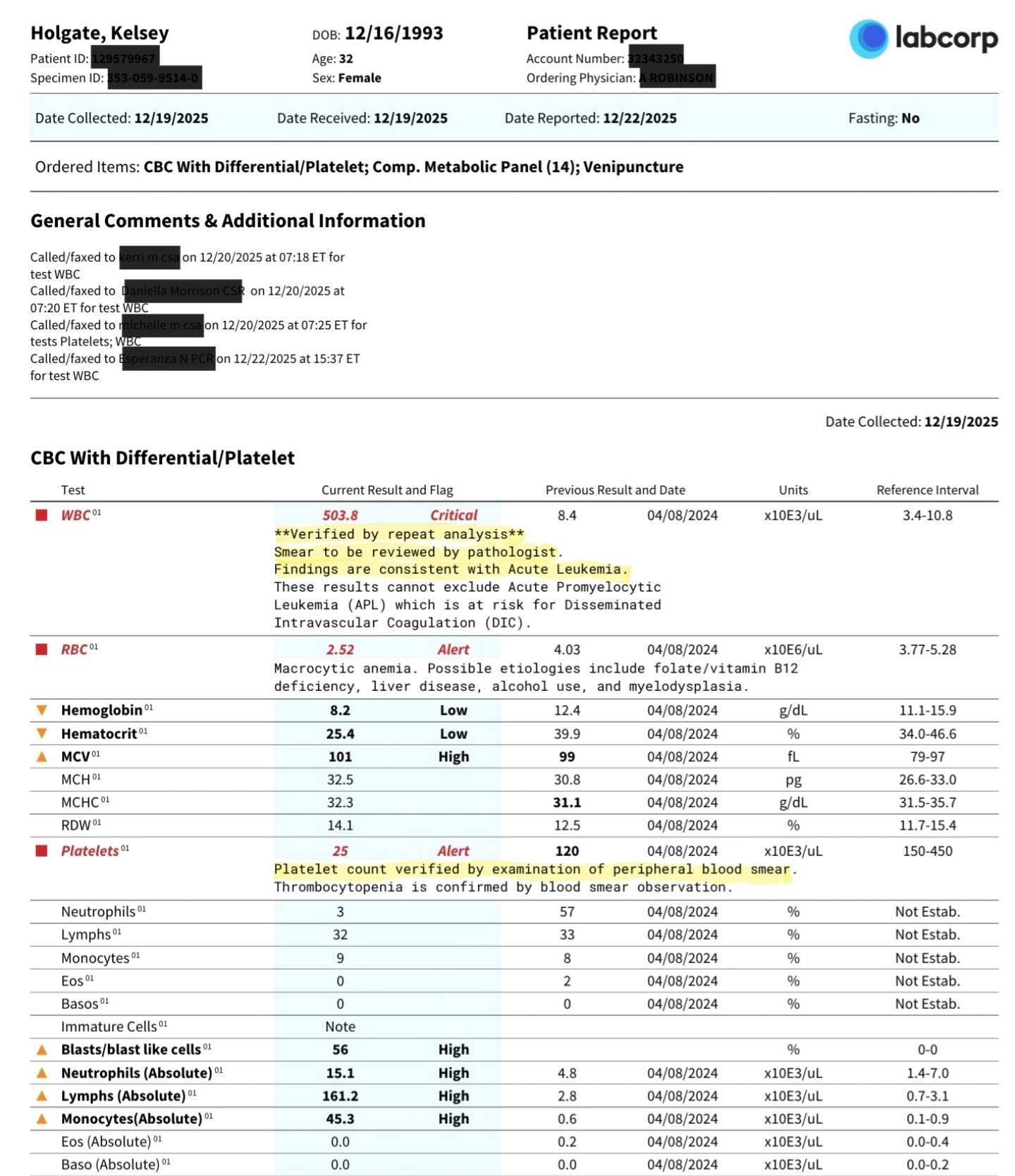• White blood cell count: 503 (normal 4.8–10.8)