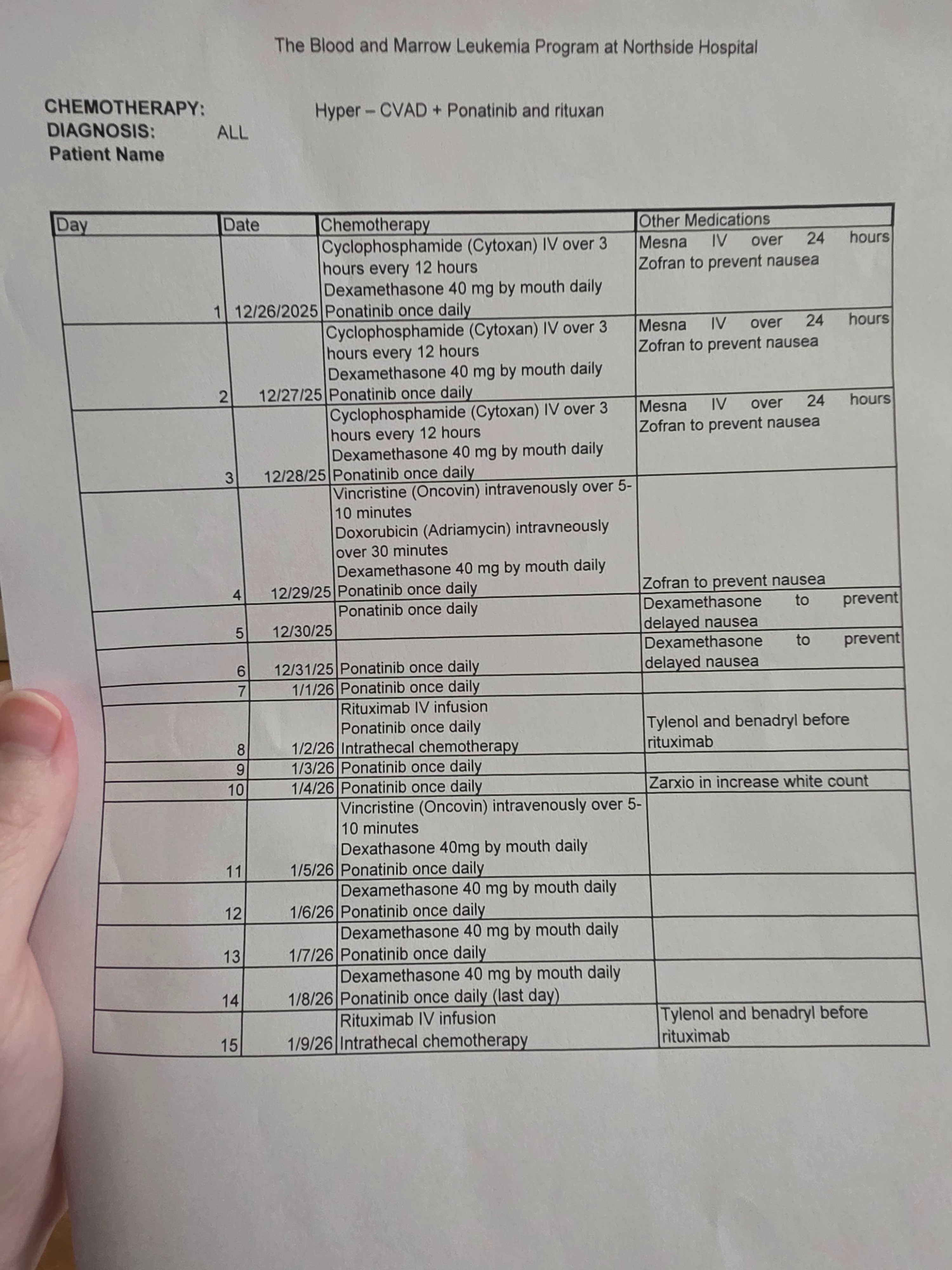 The hospital repeated testing multiple times to rule out error. After blood smears, extensive labs, and a bone marrow biopsy, I was transferred to Northside Hospital in Atlanta, where I was diagnosed with Acute Lymphoblastic Leukemia.