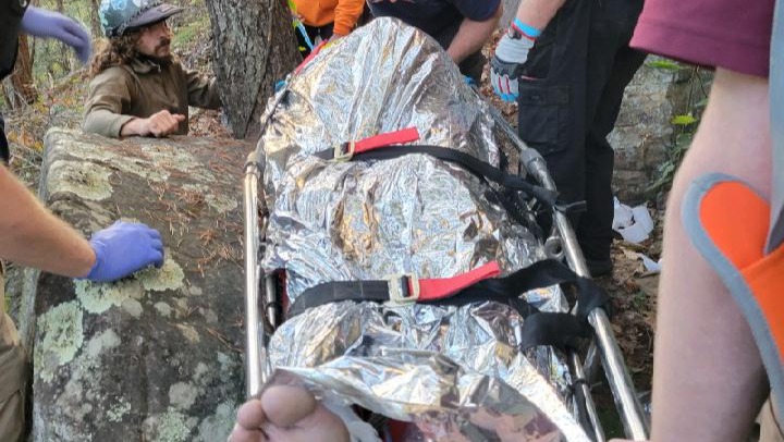 When we found him he was laying in a pile of sticks like it was a recliner. Holding up his obviously broken leg, two sticks protruded through his calf. His right arm was also noticeably broken, he was mostly concerned with his back and pelvis areas. We were able to jam a few more sticks in to help support his back until Rescue showed up. The first ranger showed up in about 30 minutes, with a group of young kids in flip-flops. We thought this was his team at first and we'd never get him out of there but they were just people that he found in the parking lot to help carry things and take notes. It was about 45 more minutes until rescue showed up. Due to the wind at the time, probably a 50 mph gust, they wouldn't airlift him from the spot of the accident, and there was no way to get him up to the trail so they allowed us to cut trees out in a straight path down the mountain. The rescue team followed with Kevin using rigging systems to lower him down the mountain. Once we got him to the bottom they were able to get him to a place where they could Airlift him down to Erlanger Hospital in Chattanooga. Overall, I believe over 50 people were involved in the volunteer rescue. It took about 5 hours to get him out.