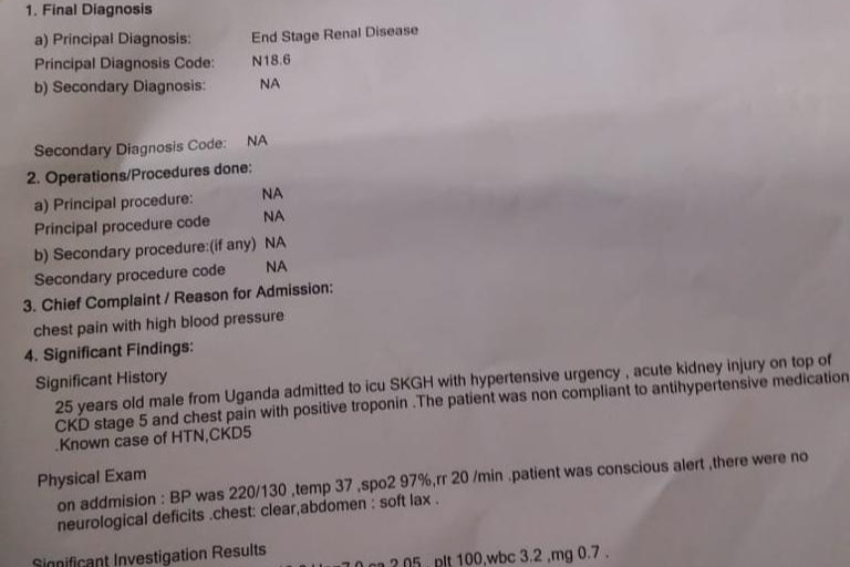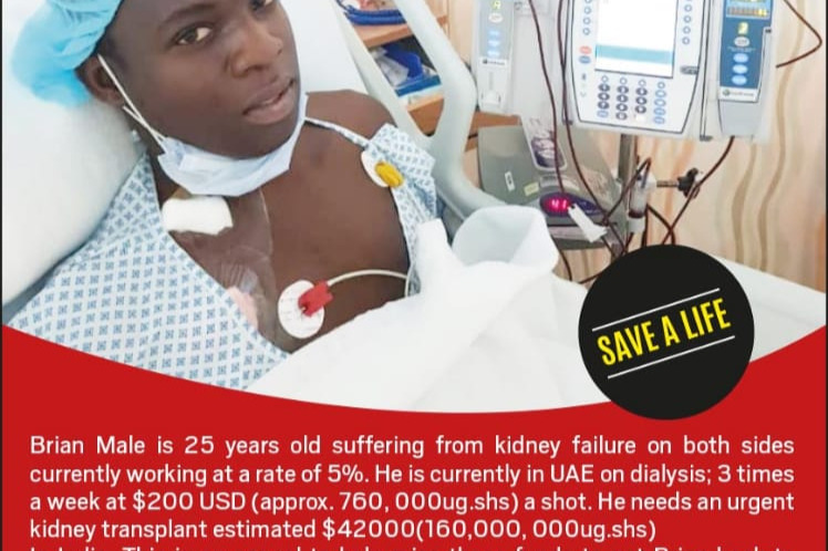 Brian Male is a 25-year-old suffering from double kidney (renal) failure. His acute condition has progressed to dialysis-dependent end-stage renal disease with his kidney's functioning at a rate of only 5%. He is currently an in-patient on dialysis in the United Arab Emirates (UAE) receiving 3 dialysis treatments per week at $200 USD per treatment (approximately, 760 000 UgShs). Brian urgently needs a kidney transplant to be performed in India within a month at an estimated $42, 000 USD/ $58,000 CAD (160, 000, 000 UG.shs).