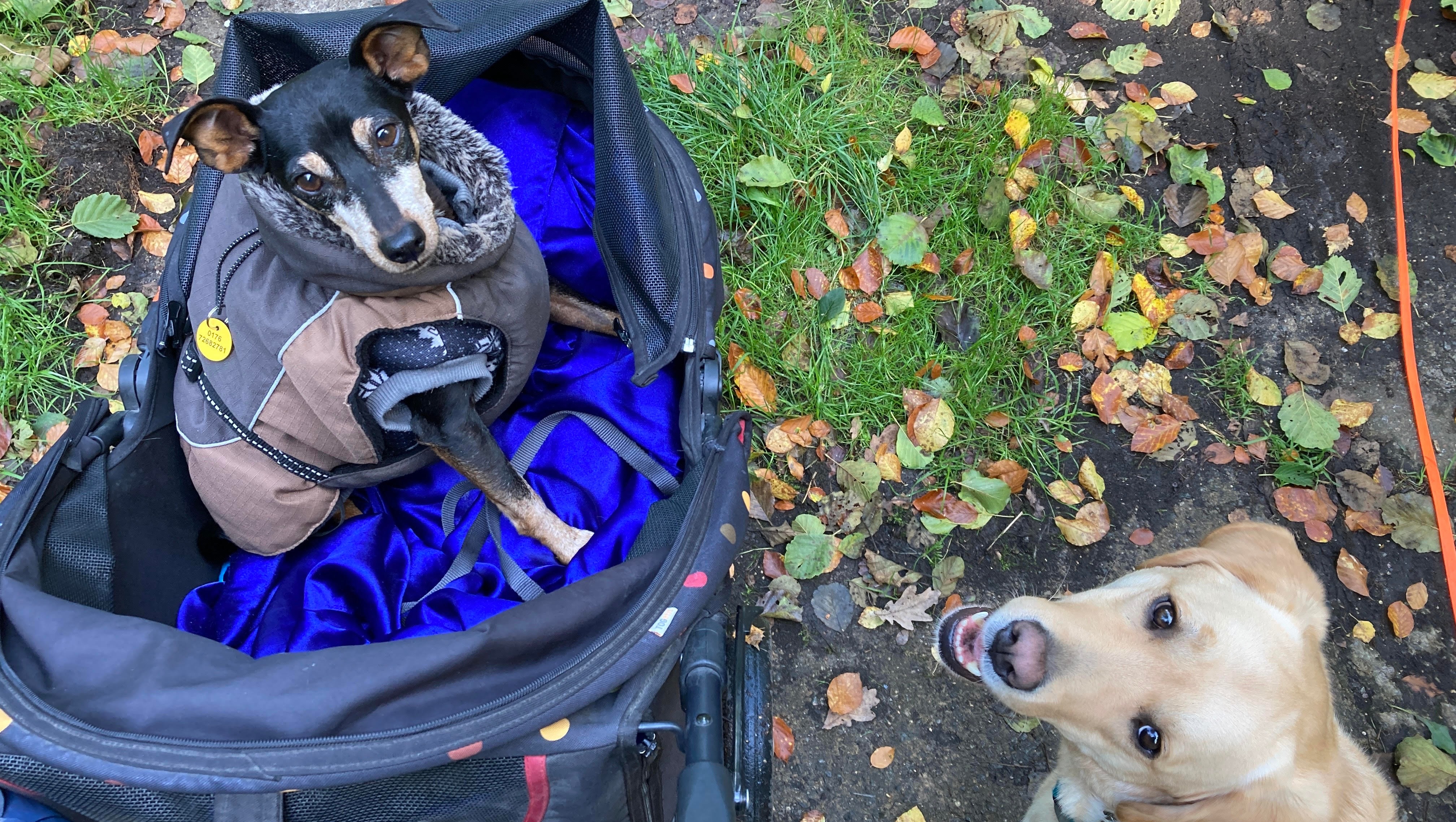 Zum ersten haben wir sogar einen Hundebuggy geliehen bekommen, damit ich evtl. irgendwann doch mal wieder bei den Touren dabei sein kann. Momentan geht das aber noch nicht, da ich noch zu schmerzhaft bin und mich im Buggy sehr verkrampfe. Evtl. muss auch da eine Art Anhänger her, der Buggy ist so hoch und das finde ich echt blöd.