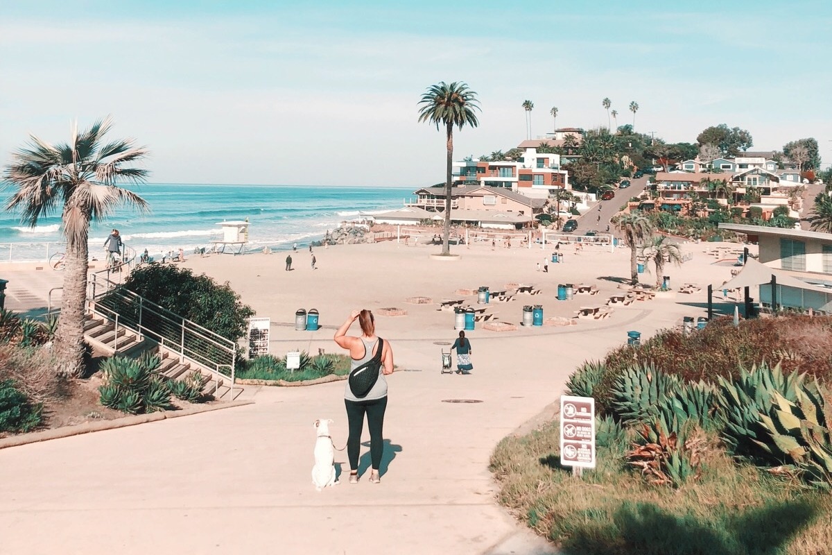 Kylie and her rescue dog, Enzo, enjoying San Diego's beach scene