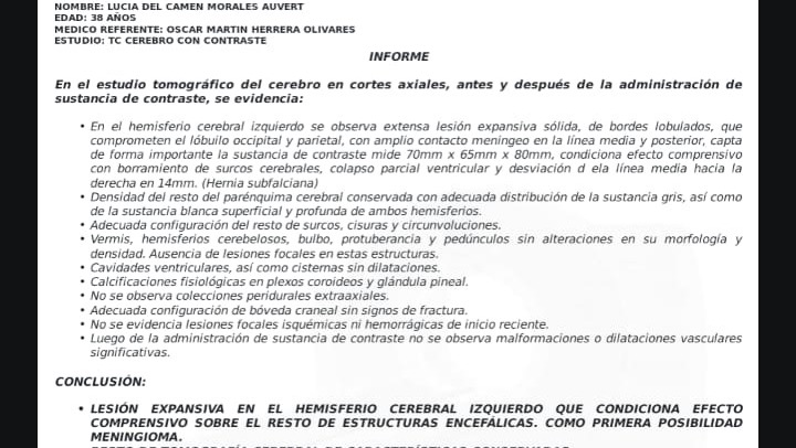 Hola me llamo Lucia del Carmen Morales Auvert tengo 38 años y estoy recaudando fondos ya que tengo que ser intervenida de emergencia debido a un proceso expansivo intracerebral y no cuento con los recursos necesarios para cubrir dicha operación, a su vez tengo que realizarme una Angiografia, gastos médicos y gastos quirúrgicos.