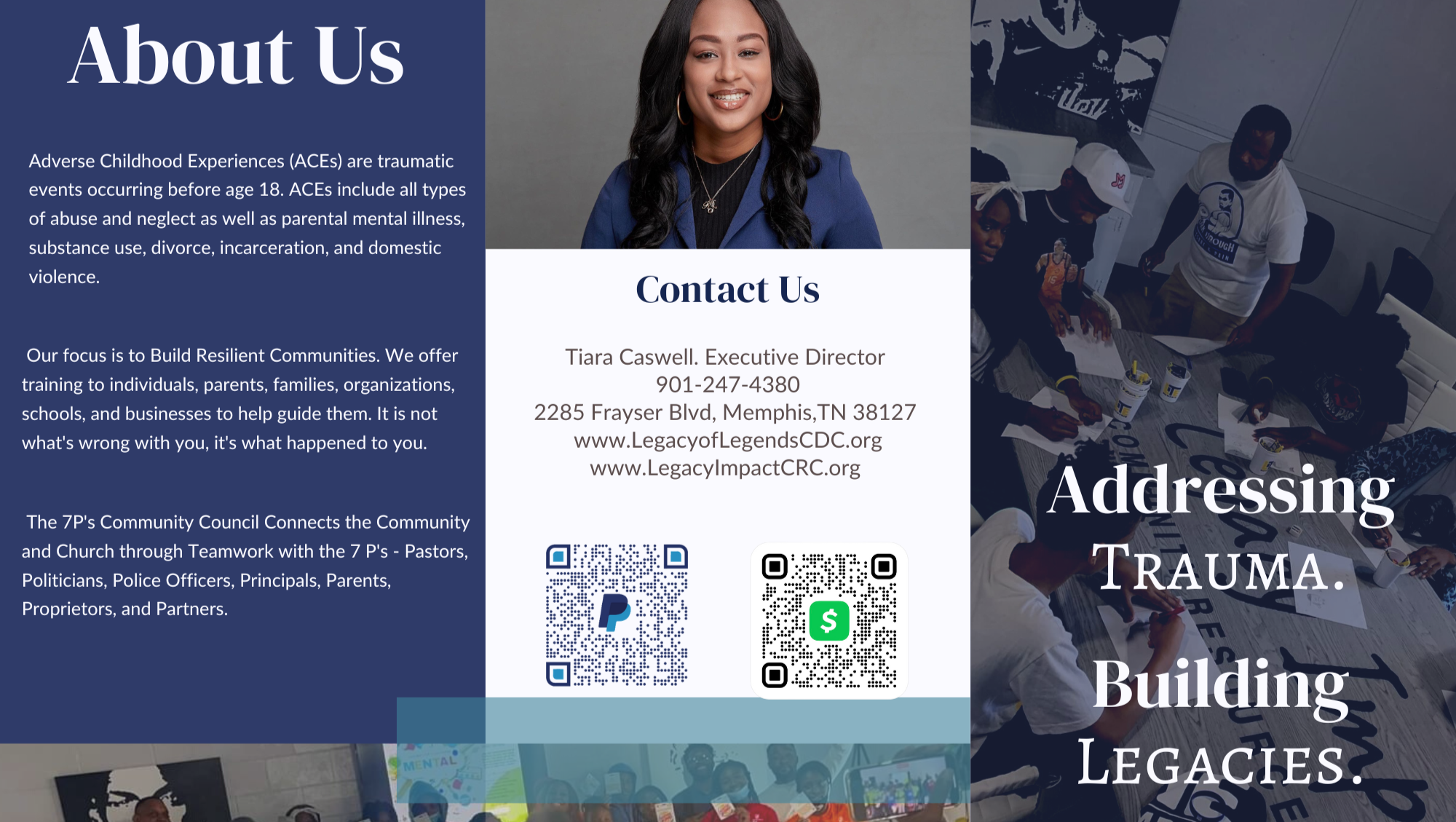The city of Memphis has a poverty rate of 26.9%. Child poverty is 44.7% and black children is 48.9%. Memphis has reverted to being the poorest MSA with a population of over a million people. (UofM report) Shelby County Schools has over 40K students living in households that has $10K or less annual income. 1 in 4 Tennessean has 4 or more adverse childhood experiences. Legacy of Legends CDC is committed to mitigate Adverse Childhood Experiences through leadership, entrepreneurship, and performing arts while providing a safe, healthy, nurturing environment for community stakeholders. Our focus is to Build Resilient Communities. We offer training to individuals, parents, families, organizations, schools, and businesses to help guide leading with “It is not what's wrong with you, it's what happened to you.” Within this community resource hub will include Children Ballet in our Performing Arts Center, Basketball Leagues in our Gymnasium, and many community partners to provide mentoring, life skills, ACEs awareness, etc...