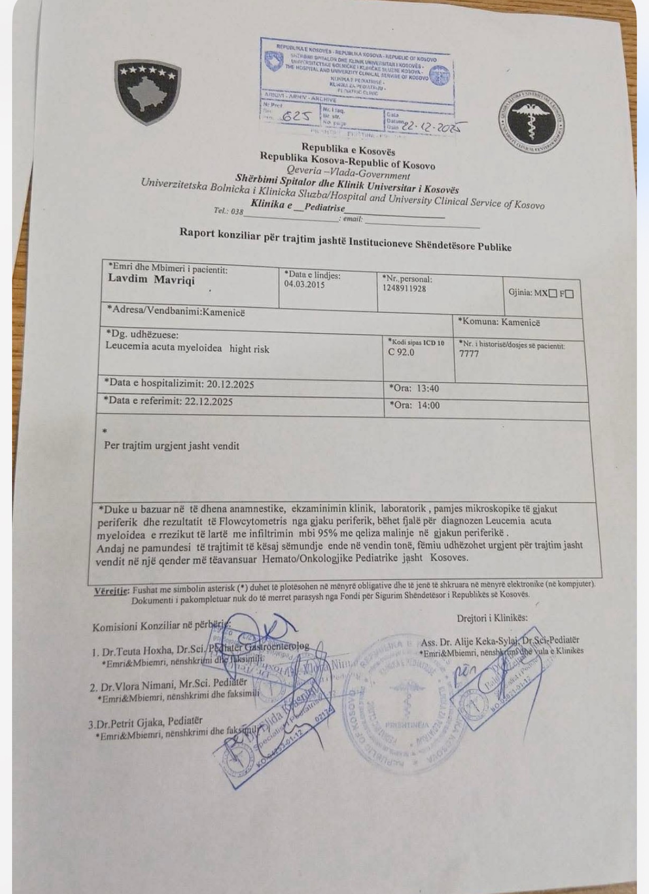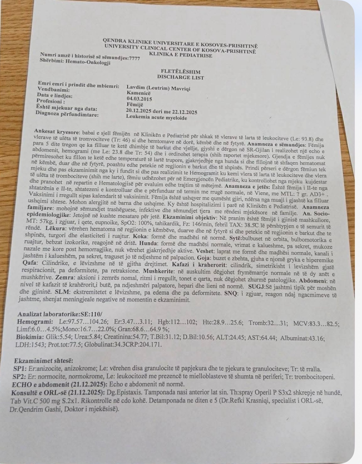 Djali (nipi) ynë Lavdim Mavriqi (i lindur më 04.03.2015) është diagnostikuar me Leukemi Akute Mieloide - rrezik i lartë. Aktualisht ndodhet në gjendje te rëndë shëndetesore dhe ka nevojë urgjente per trajtim jashte vendit, pasi ky trajtim nuk mund te realizohet ne Kosovë.