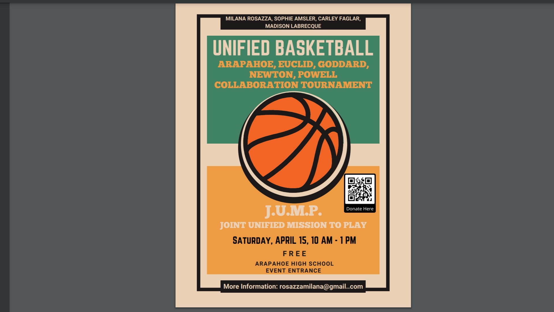 We are collecting money in hopes of hosting a final Unified game on April 15th with customized T-shirts for jerseys to celebrate the bonds and relationships between the unified kids and other peers. At this final game, we hope to have pizza, games, and lots of school spirit to encourage these kids and get them excited for high school!