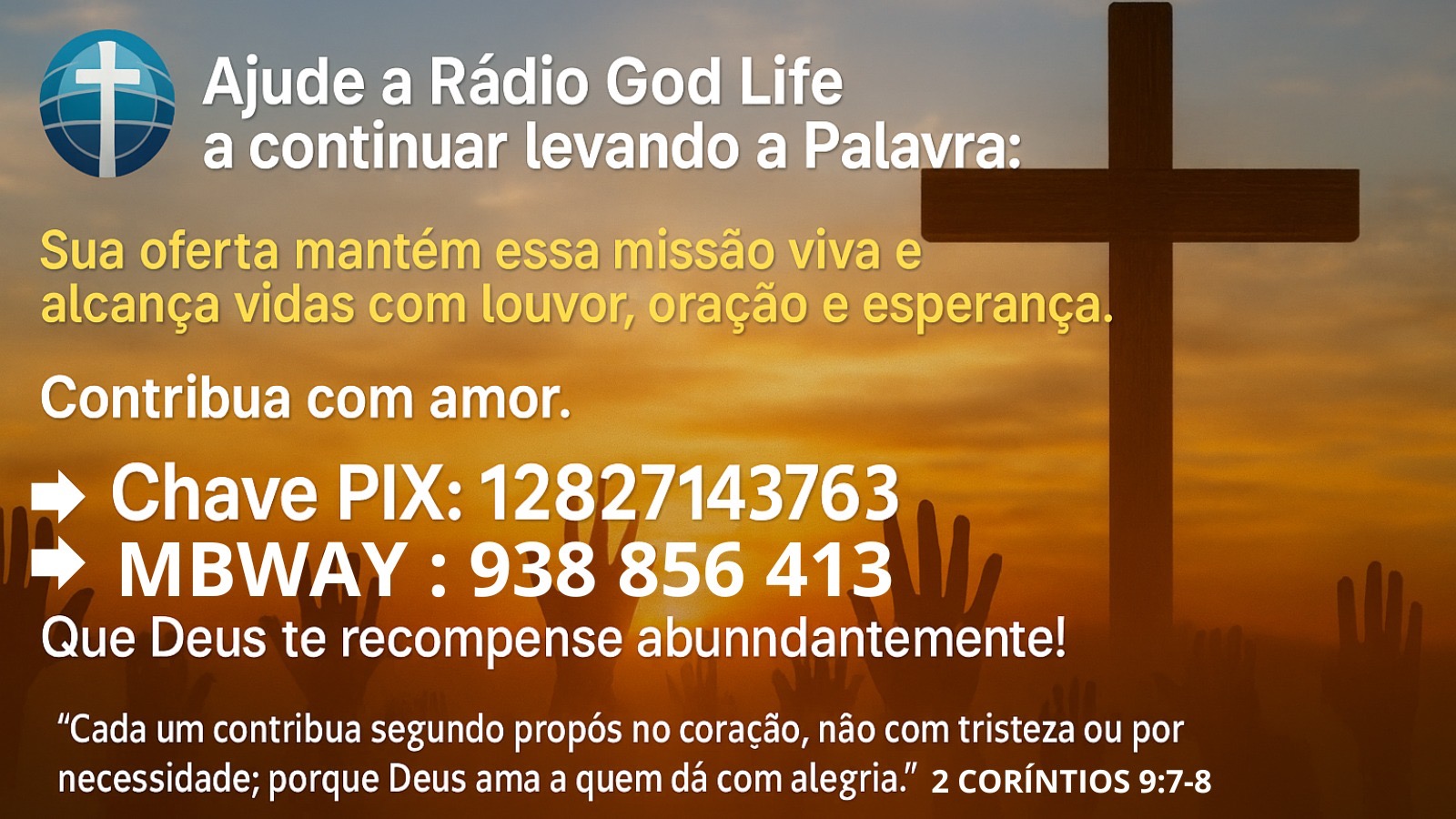 "Cada um contribua segundo propôs no coração, não com tristeza ou por necessidade; porque Deus ama a quem dá com alegria."