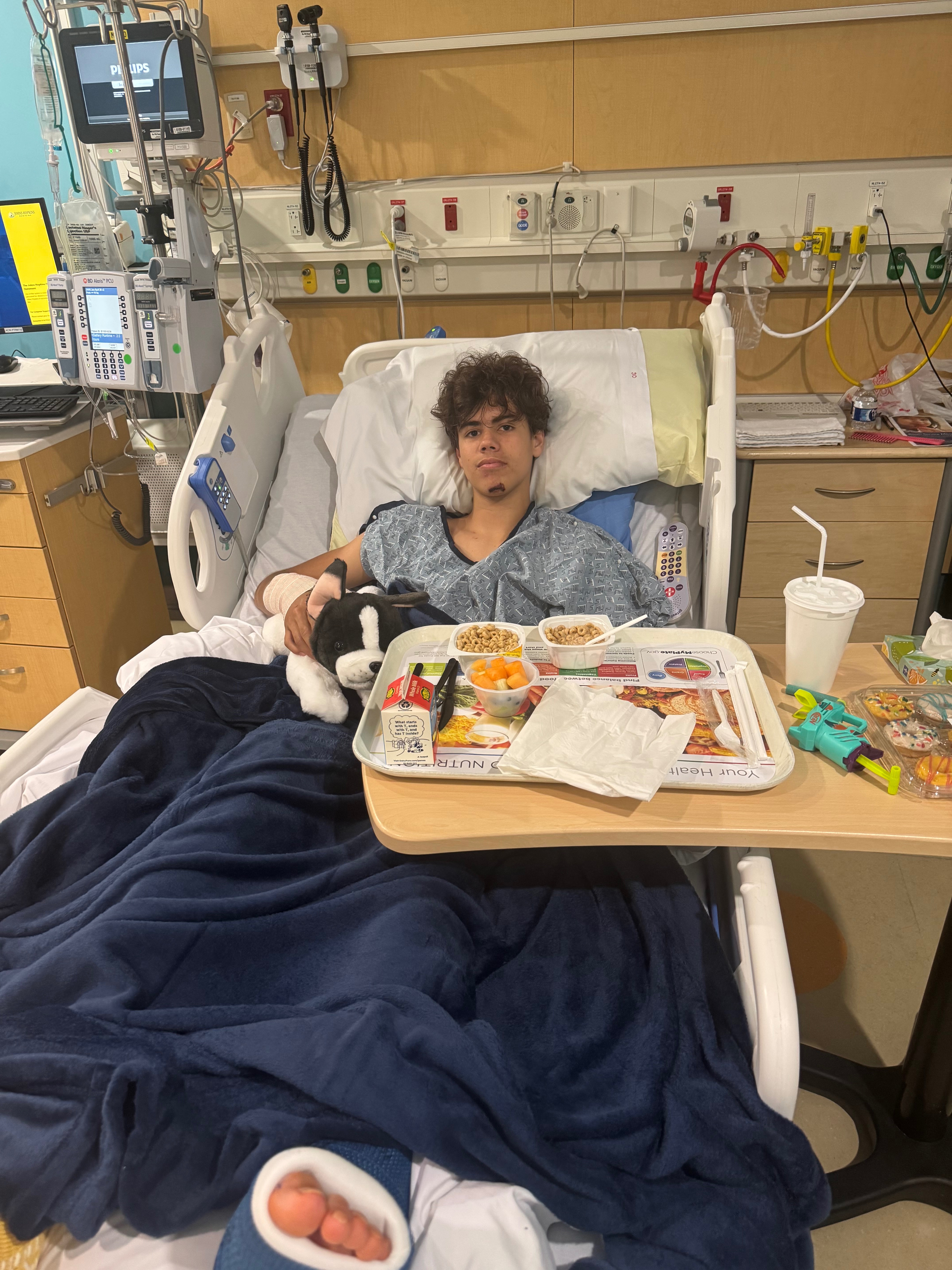 What happened and why this is so serious He sustained a comminuted patellar fracture, meaning his kneecap and part of his femur were shattered into multiple pieces, requiring complex surgical reconstruction. He also suffered extensive trauma to his ankle, including significant injury to cartilage, supporting ligaments, and bone. His initial surgery required prolonged operative time (5 hours) for careful cleaning of damaged tissue, realignment, stabilization, and repair. Because of the seriousness of the damage and the repairs that were performed, he is currently not allowed to bend his knee to protect healing. At this stage he is non–weight-bearing on both legs and cannot walk, stand, or move independently. He also has a broken right hand (waiting on surgery and cast) His recovery will involve prolonged immobilization followed by intensive rehabilitation and physical therapy aimed at restoring range of motion, strength, and mobility. We are profoundly grateful his life was spared. But the path ahead is long, painful, and uncertain—and it will take time, repeated procedures, and extensive therapy for him to regain independence and function.