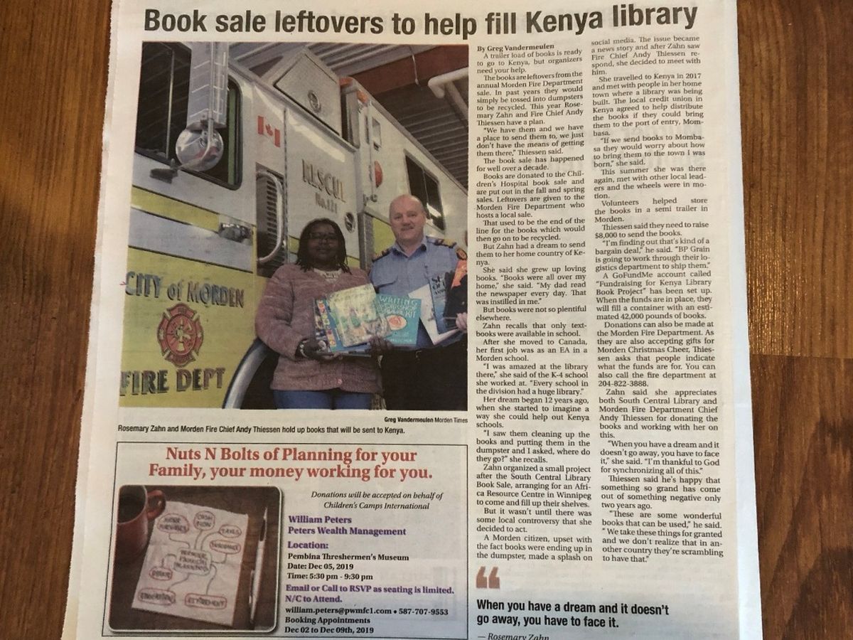 In May 2019, I finally got the courage to tackle my vision. Many volunteers came together to pack these books into a huge, 40 ft trailer .The Morden fire department was instrumental in supporting this project in this way, after their own book sale with more left over books. Now we need $ CA 8, 000 (eight thousand Canadian dollars!) in order to hire a container for shipping and the costs that go with it. Destination, Kenya.