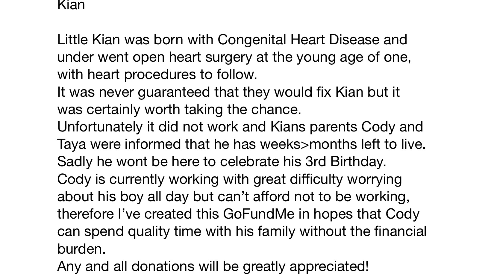 My name is Shannon and I’m the Great Aunty of Kian, I am fundraising to help my nephew Cody be able to spend time with Kian and not have to be concerned about days missing on his pay cheque.