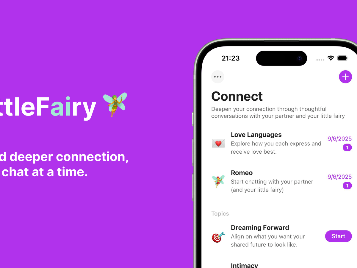We’re the creators of LittleFairy, a gentle relationship app designed to help couples reflect, reconnect, and grow closer — whether together or apart. Think of it as a magical little space where love gets to breathe, through deep conversations, playful prompts, and thoughtful AI support.