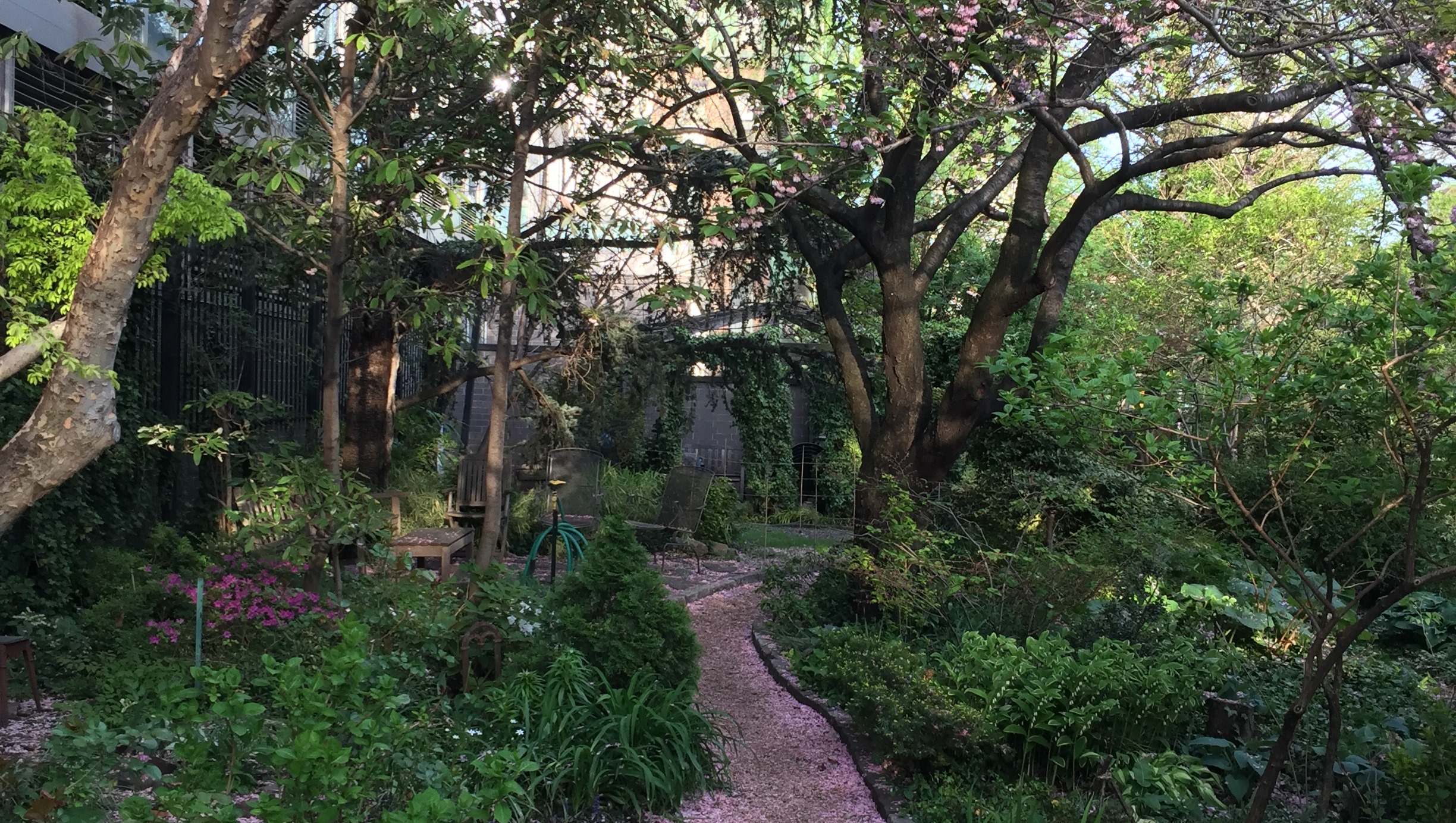 Over the years, the volunteers planted trees, including the iconic dawn redwood, one of New York City's designated Great Trees, and created a lush landscape through hard work and no small amount of compost. In 2005, after the construction of the residential building next door, the eastern section (near Second Avenue) was added to the garden, and the gardeners added a second pond, fruit trees and new places to sit back and enjoy the peaceful surroundings.