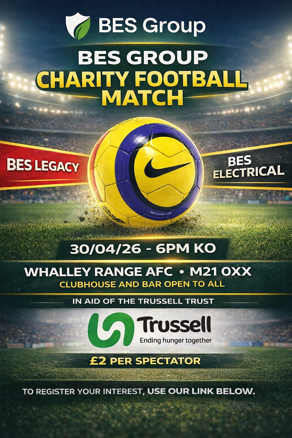 We’re delighted to announce that BES will be hosting a Charity Football Match on 30/04/2026, at 6pm, at Whalley Range AFC, M21 0XX — and we’d love as many of you as possible to get involved. It promises to be a tasty affair in a classic derby between BES Legacy vs BES Electrical.