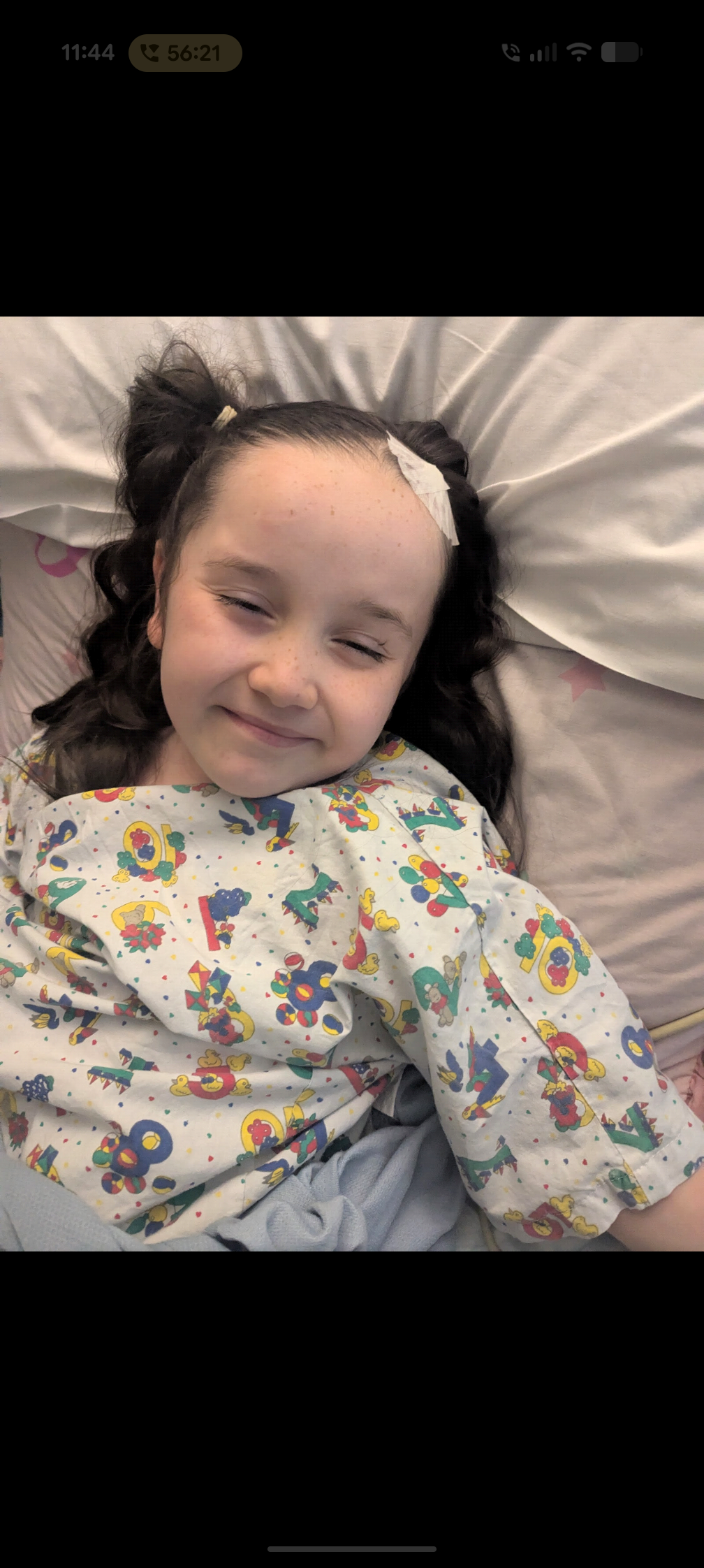 Lola was very nervous however I reassured her that she was going to go to sleep and when she woke up she would have a small bandage on her head and her headaches would be gone. Lola was extremely brave and had her surgery that day. It took roughly 4 hours and when the procedure was completed they explained to me that they had fitted an ommaya reservoir into her brain (this is a catheter that sits under the skin on her head leading to the fluid ventricle in her brain) they also expressed that they tried to perform a biopsy but was unsuccessful due to this creating a bleed and not being at the correct angle to complete this. Lola would need to recover and we would monitor the tumor with regular MRI scans. We were reassured that it appears to be a low grade glioma (non cancerous) based on the patterns of the MRI and that it shouldn't cause any further issues.