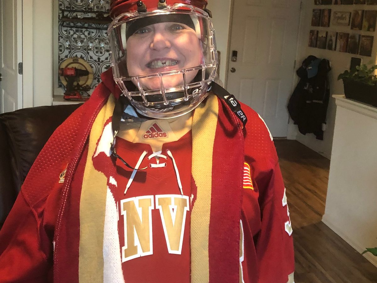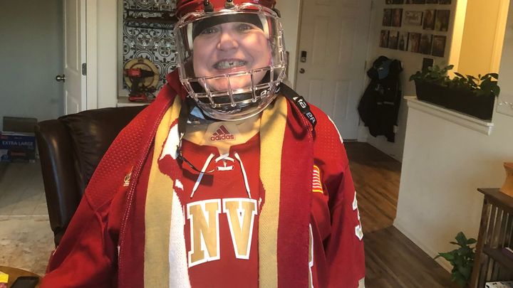Lori now has this small helmet with a face shield for hockey games in case another puck comes her way. She’s also a huge Broncos and Rockies fan, but doesn’t get to go very often now.