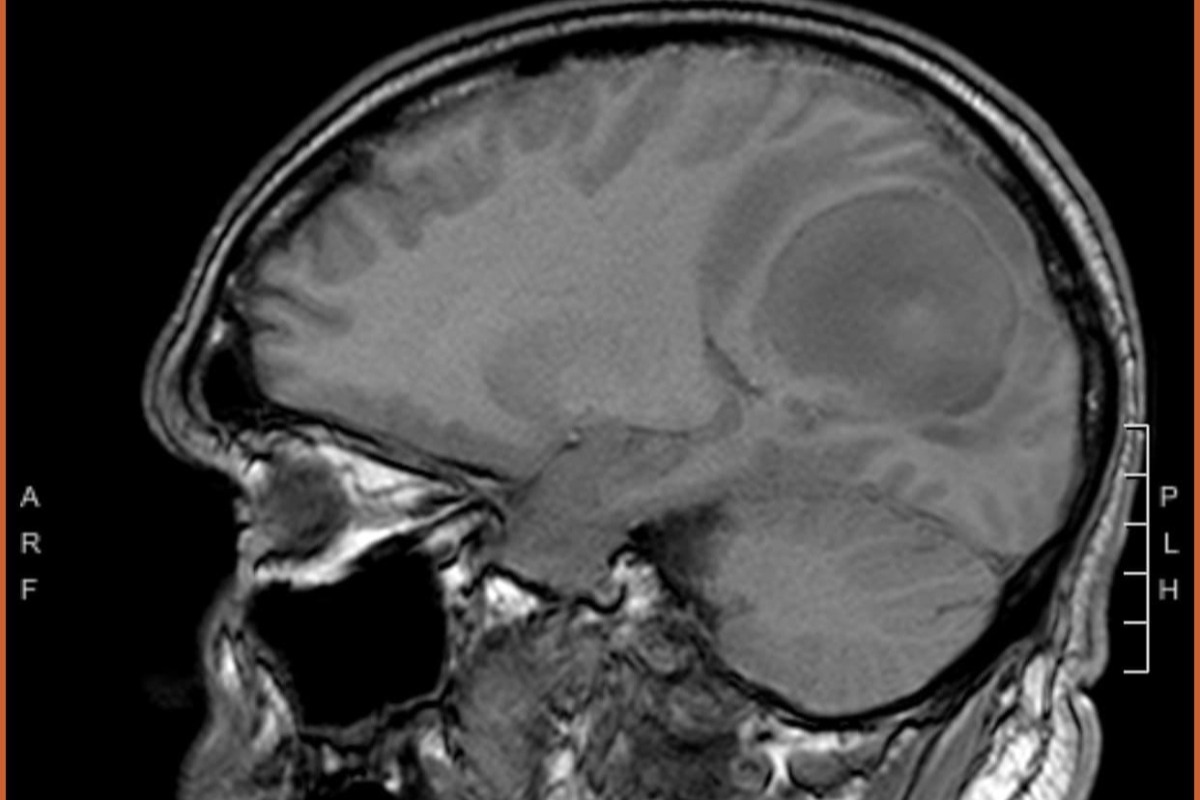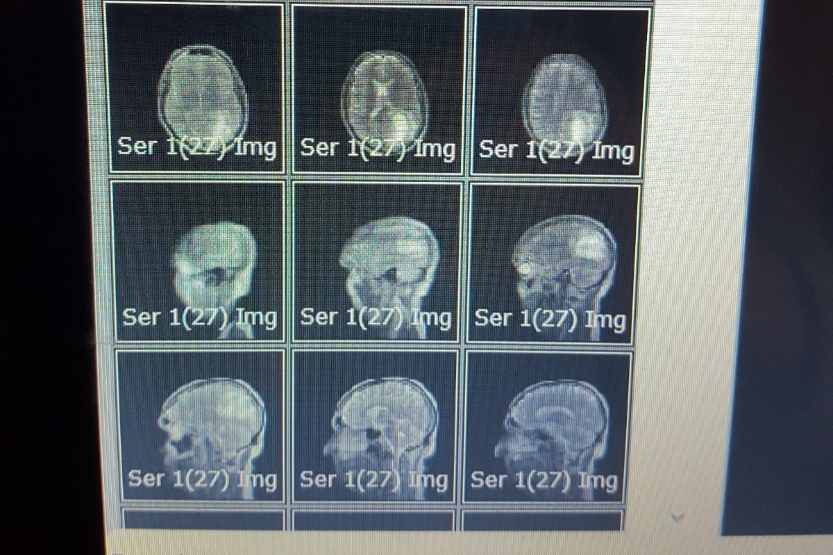 Eric's brain scan.   Mass is in the upper right.