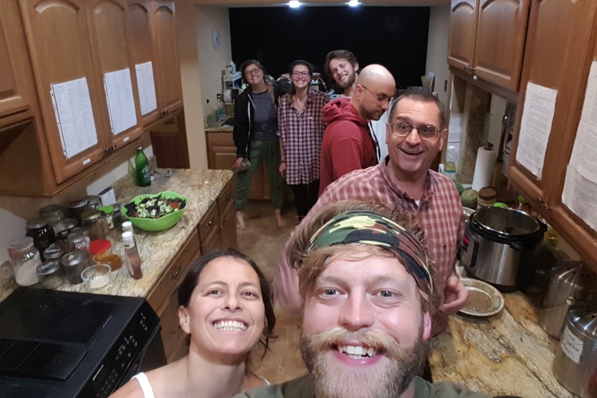Eric and Yadi in the kitchen, creating an amazing meal, with WWOOF volunteers.