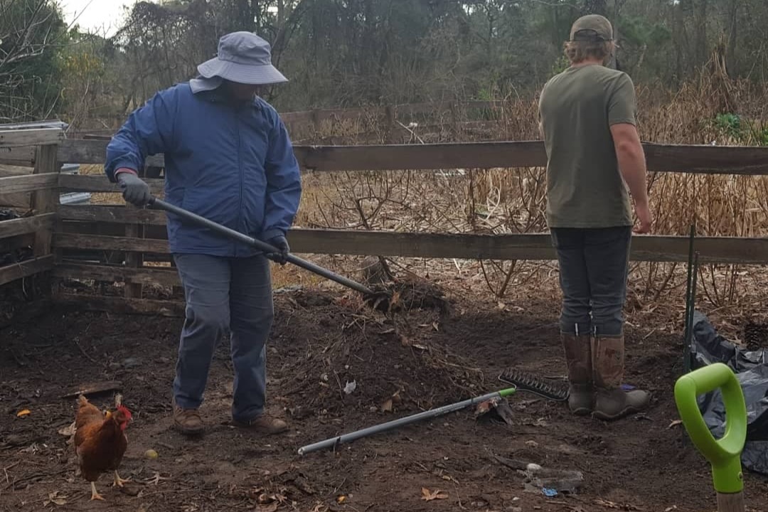 Tending to one of the manure composting piles at Our Permaculture Farm.