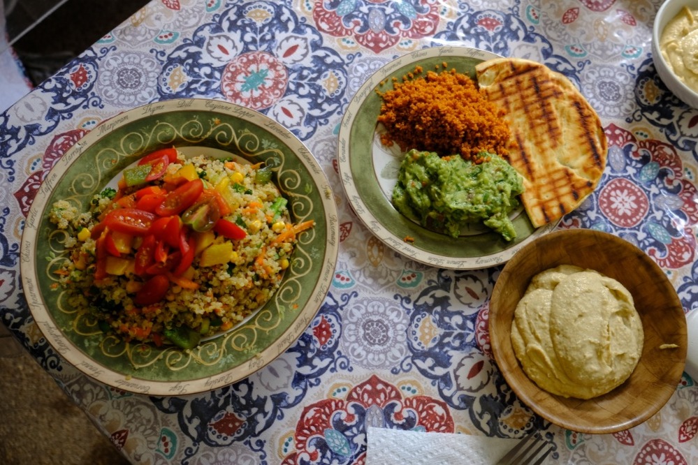 An example of one of Eric's meals, always made with so much love and intention.  Quinoa with fresh veggies and homemade dressing, from-scratch guacamole, hummus, and walnut taco meat.
